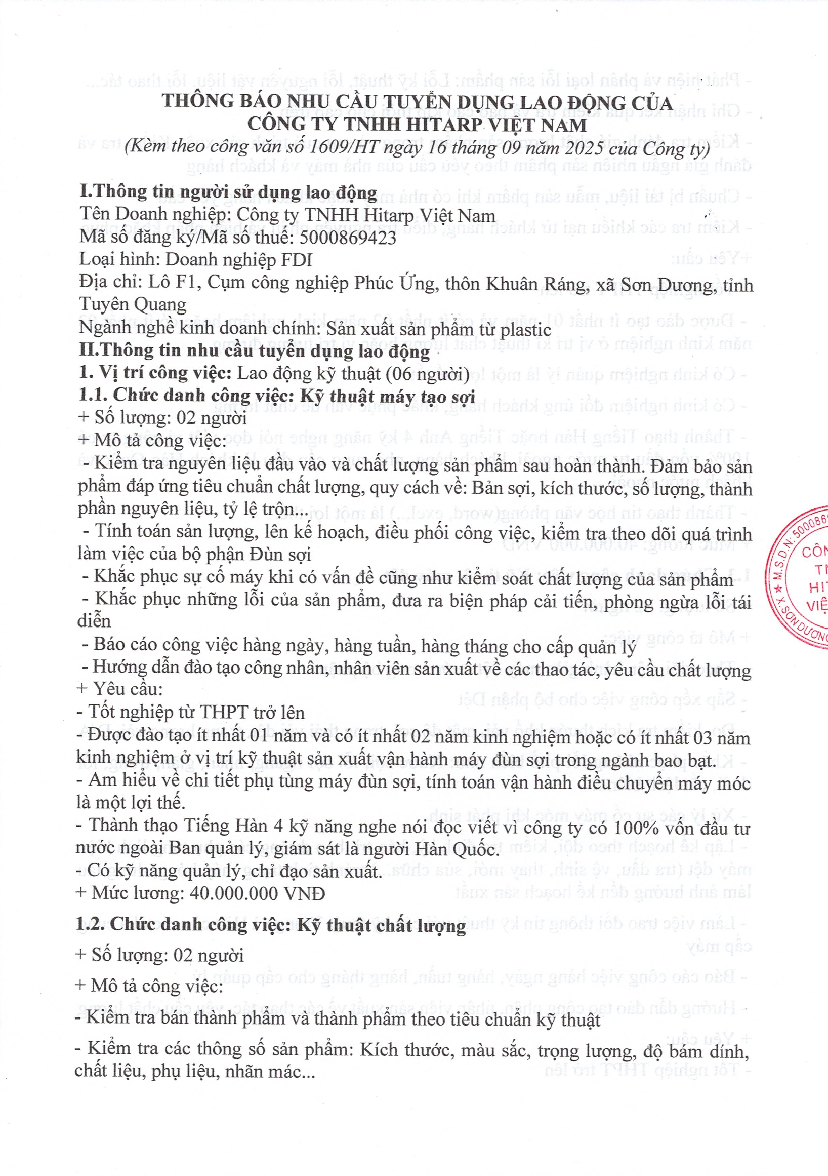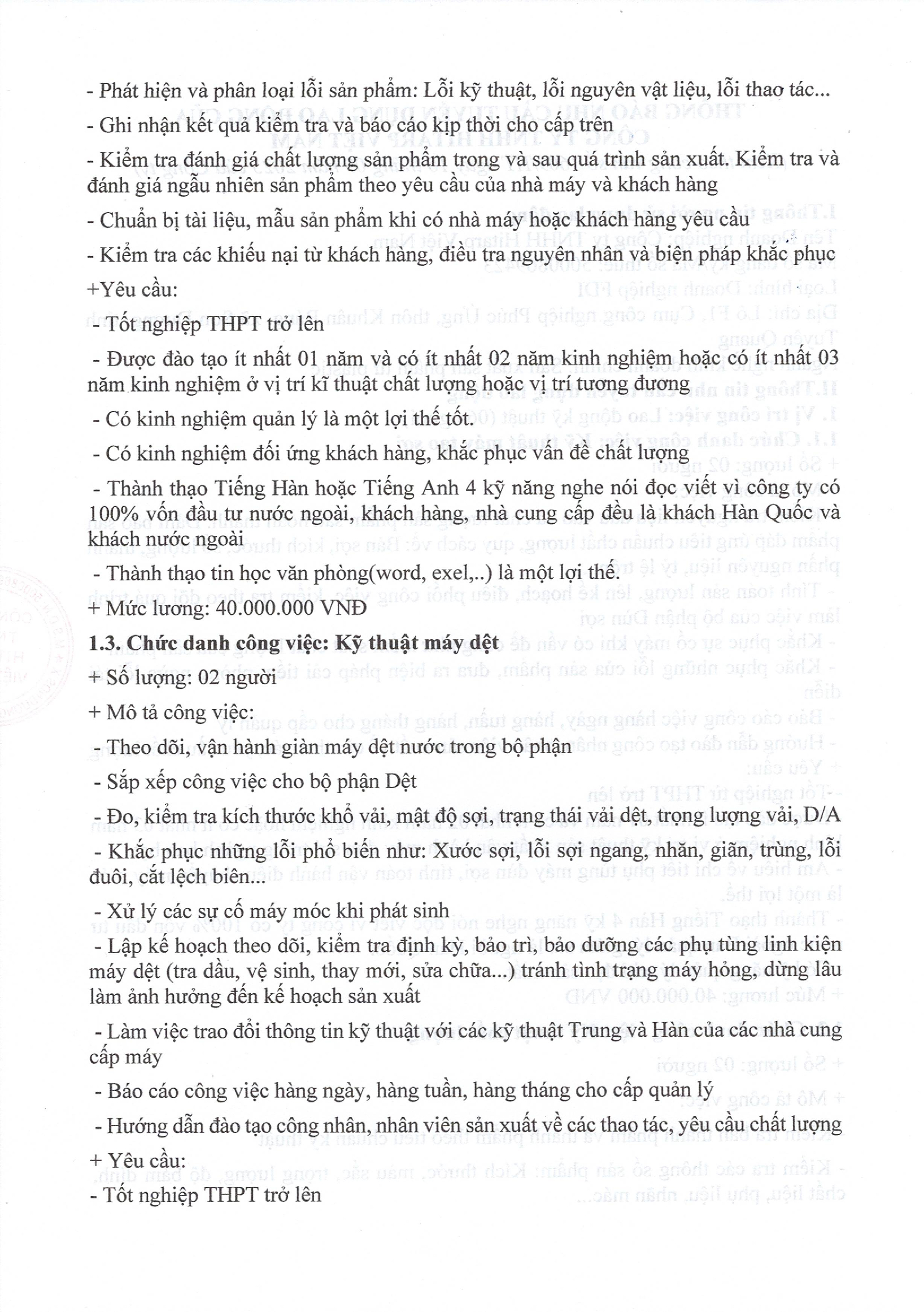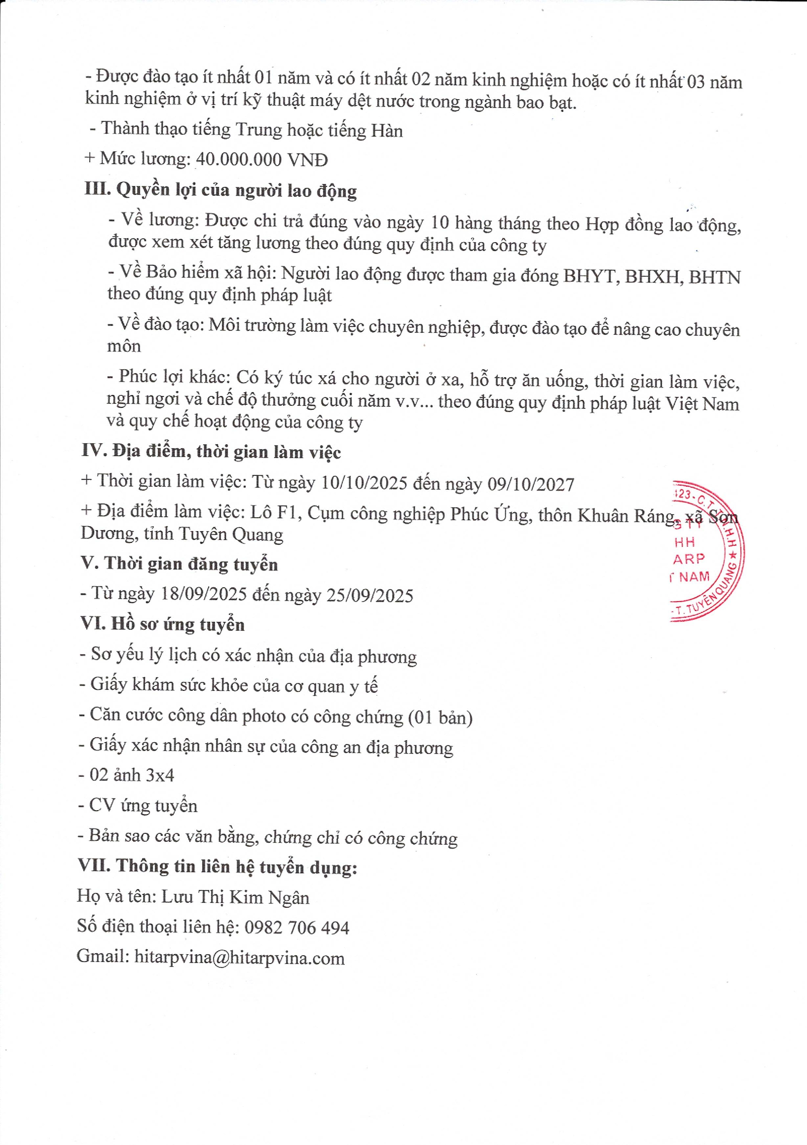THÔNG BÁO NHU CẦU TUYỂN DỤNG LAO ĐỘNG CỦA CÔNG TY TNHH Hitarp Vệt Nam