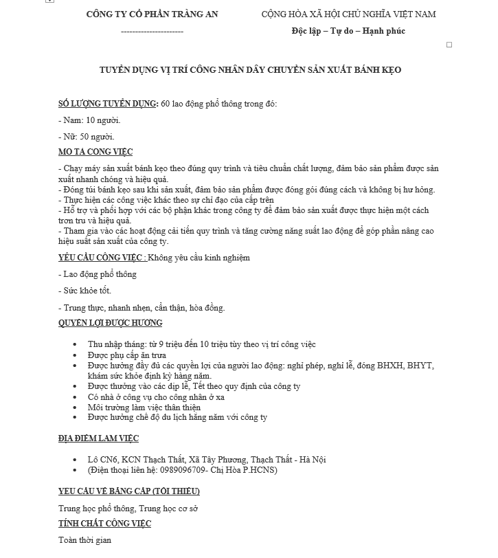 THÔNG BÁO NHU CẦU TUYỂN DỤNG LAO ĐỘNG CỦA CÔNG TY CỔ PHẦN TRÀNG AN
