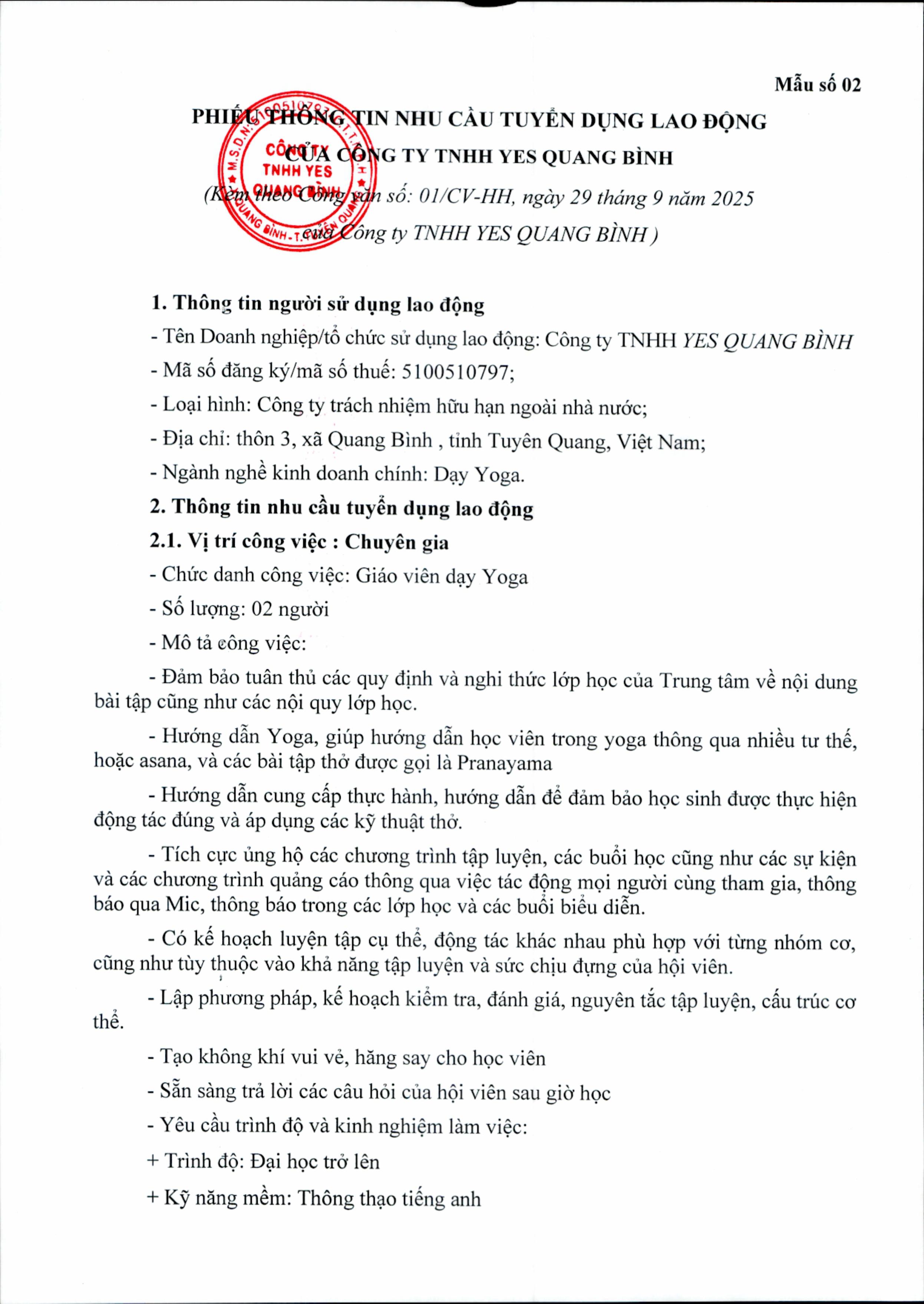 THÔNG BÁO NHU CẦU TUYỂN DỤNG LAO ĐỘNG CỦA CÔNG TY TNHH YES QUANG BÌNH