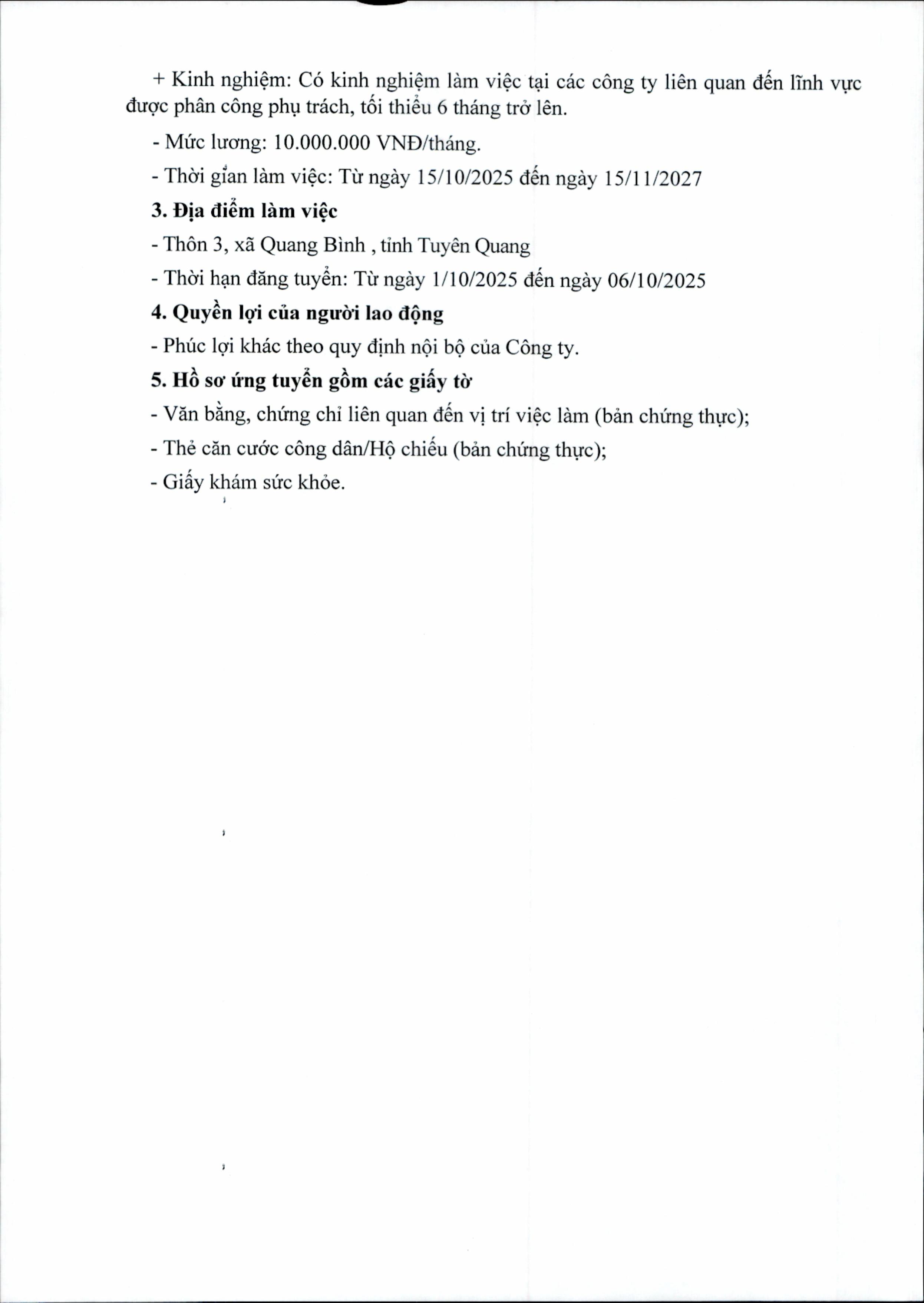 Ứng viên có nhu cầu vui lòng liên hệ: Trung tâm chính tại Tổ dân phố Hưng Thành 3, phường An Tường, tỉnh Tuyên Quang, số điện thoại 02073.818.239. Trụ sở 2 tại số nhà 224, tổ 13, phường Hà Giang 1, tỉnh Tuyên Quang, số điện thoại 02193.829.688. Văn phòng Chiêm Hóa tại thôn Vĩnh Khanh, xã Chiêm Hóa, tỉnh Tuyên Quang, số điện thoại 02073.851.699. Văn phòng Sơn Dương tại thôn Quyết Thắng, xã Sơn Dương, tỉnh Tuyên Quang, số điện thoại 02073.835.688. Văn phòng Bắc Quang tại thôn 9, xã Bắc Quang, tỉnh Tuyên Quang, số điện thoại 02193.822.386. Văn phòng Yên Minh tại tổ 1, xã Yên Minh, tỉnh Tuyên Quang, số điện thoại 02193.860.385
