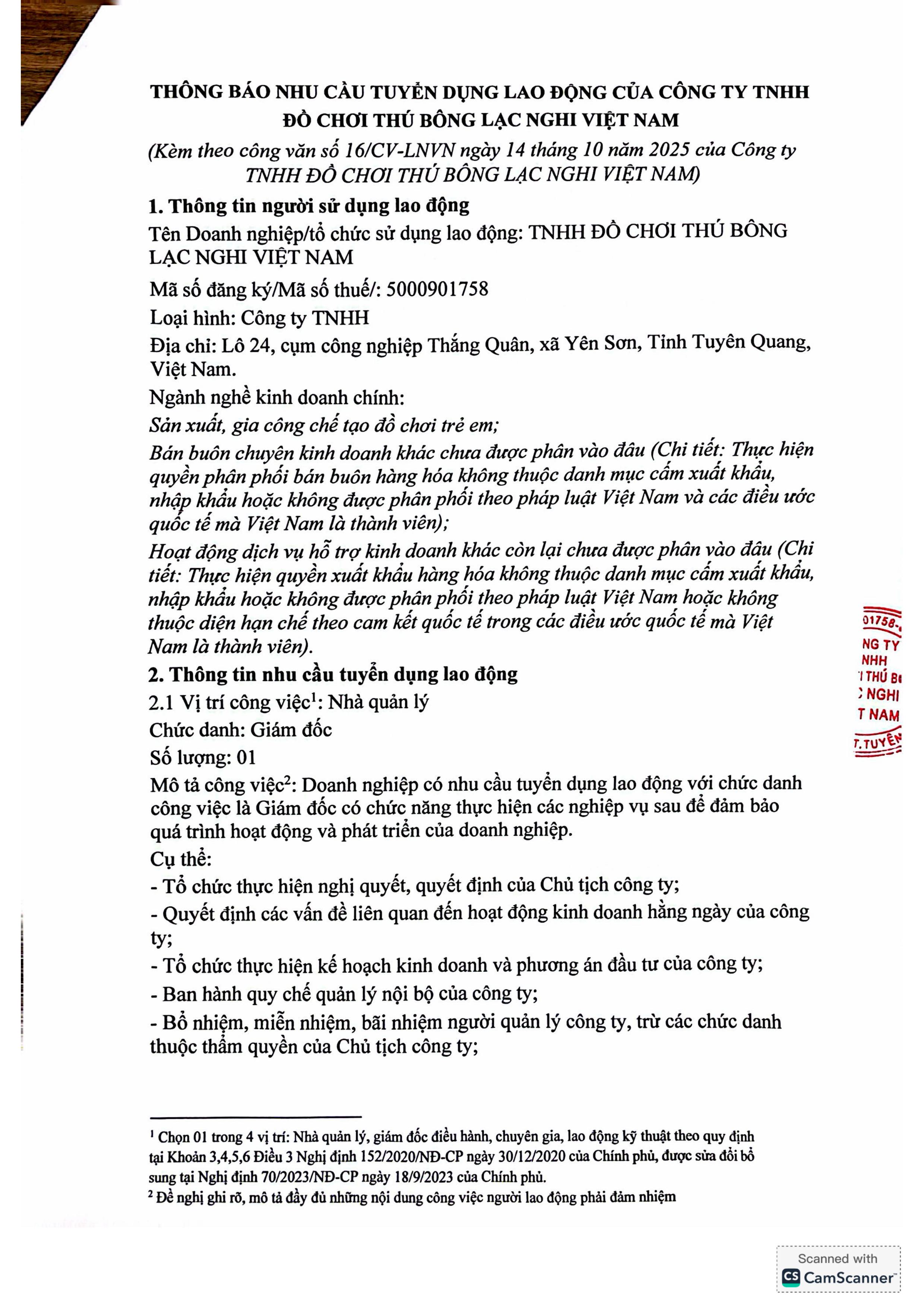 THÔNG BÁO NHU CẦU TUYỂN DỤNG LAO ĐỘNG CỦA CÔNG TY TNHH ĐỒ CHƠI THÚ BÔNG LẠC NGHI VIỆT NAM