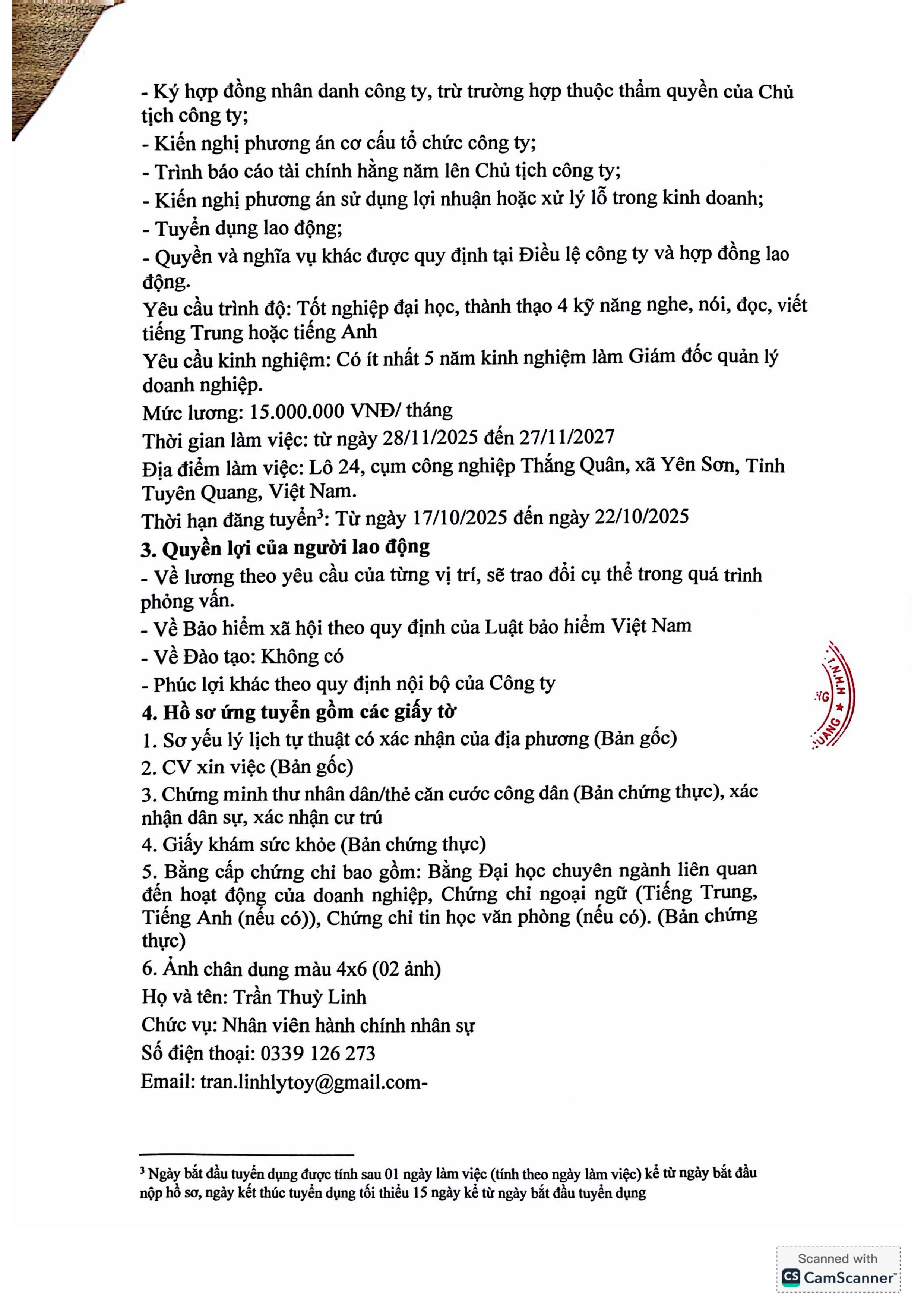 Ứng viên có nhu cầu vui lòng liên hệ: Trung tâm chính tại Tổ dân phố Hưng Thành 3, phường An Tường, tỉnh Tuyên Quang, số điện thoại 02073.818.239. Trụ sở 2 tại số nhà 224, tổ 13, phường Hà Giang 1, tỉnh Tuyên Quang, số điện thoại 02193.829.688. Văn phòng Chiêm Hóa tại thôn Vĩnh Khanh, xã Chiêm Hóa, tỉnh Tuyên Quang, số điện thoại 02073.851.699. Văn phòng Sơn Dương tại thôn Quyết Thắng, xã Sơn Dương, tỉnh Tuyên Quang, số điện thoại 02073.835.688. Văn phòng Bắc Quang tại thôn 9, xã Bắc Quang, tỉnh Tuyên Quang, số điện thoại 02193.822.386. Văn phòng Yên Minh tại tổ 1, xã Yên Minh, tỉnh Tuyên Quang, số điện thoại 02193.860.385