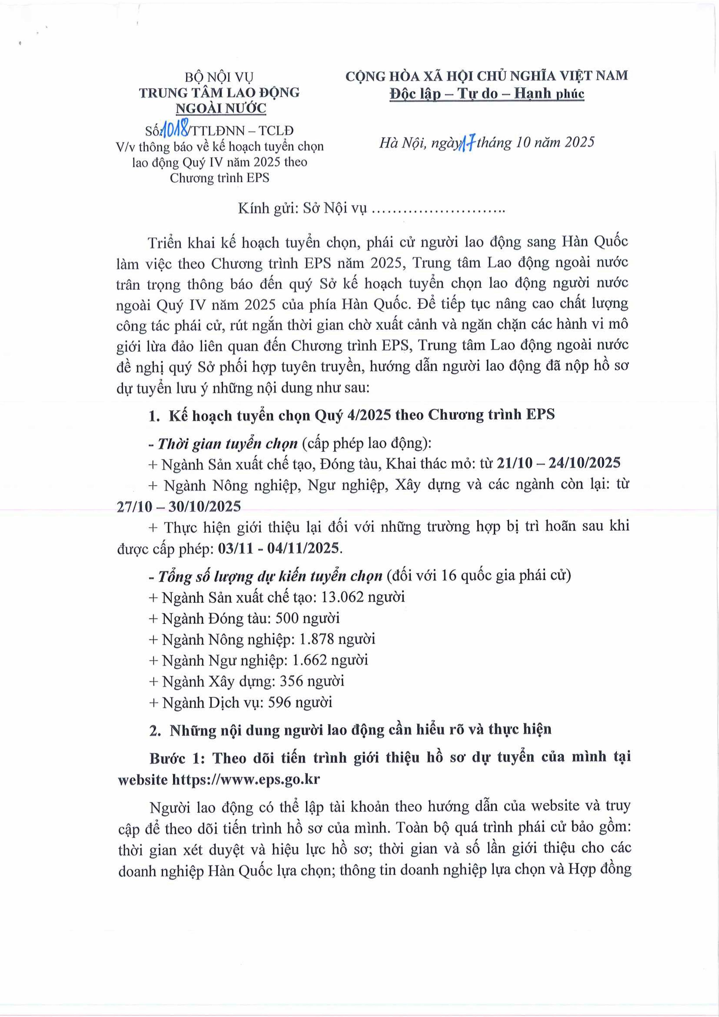 THÔNG BÁO KẾ HOẠCH TUYỂN DỤNG LAO ĐỘNG SANG HÀN QUỐC THEO CHƯƠNG TRÌNH EPS NĂM 2025