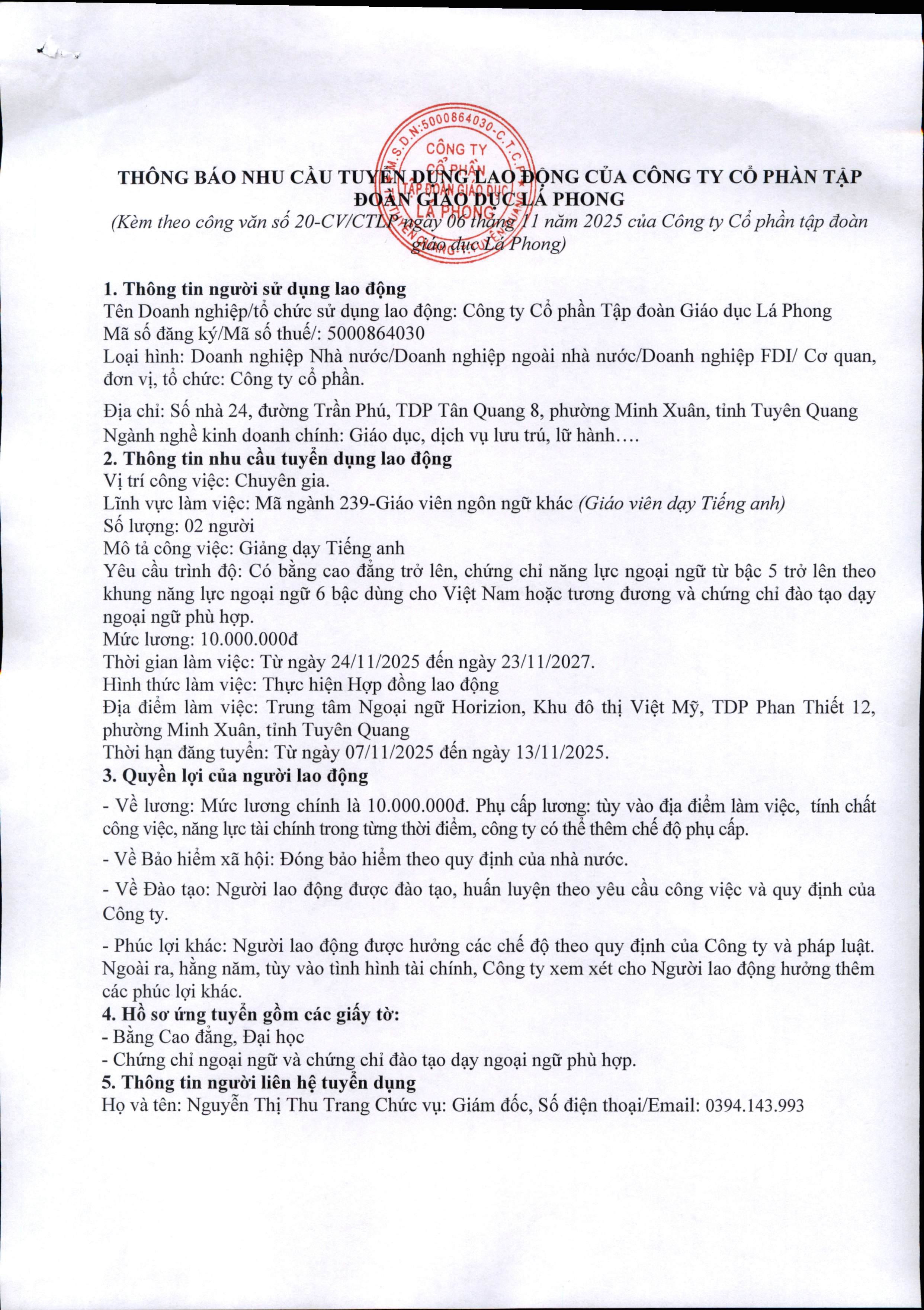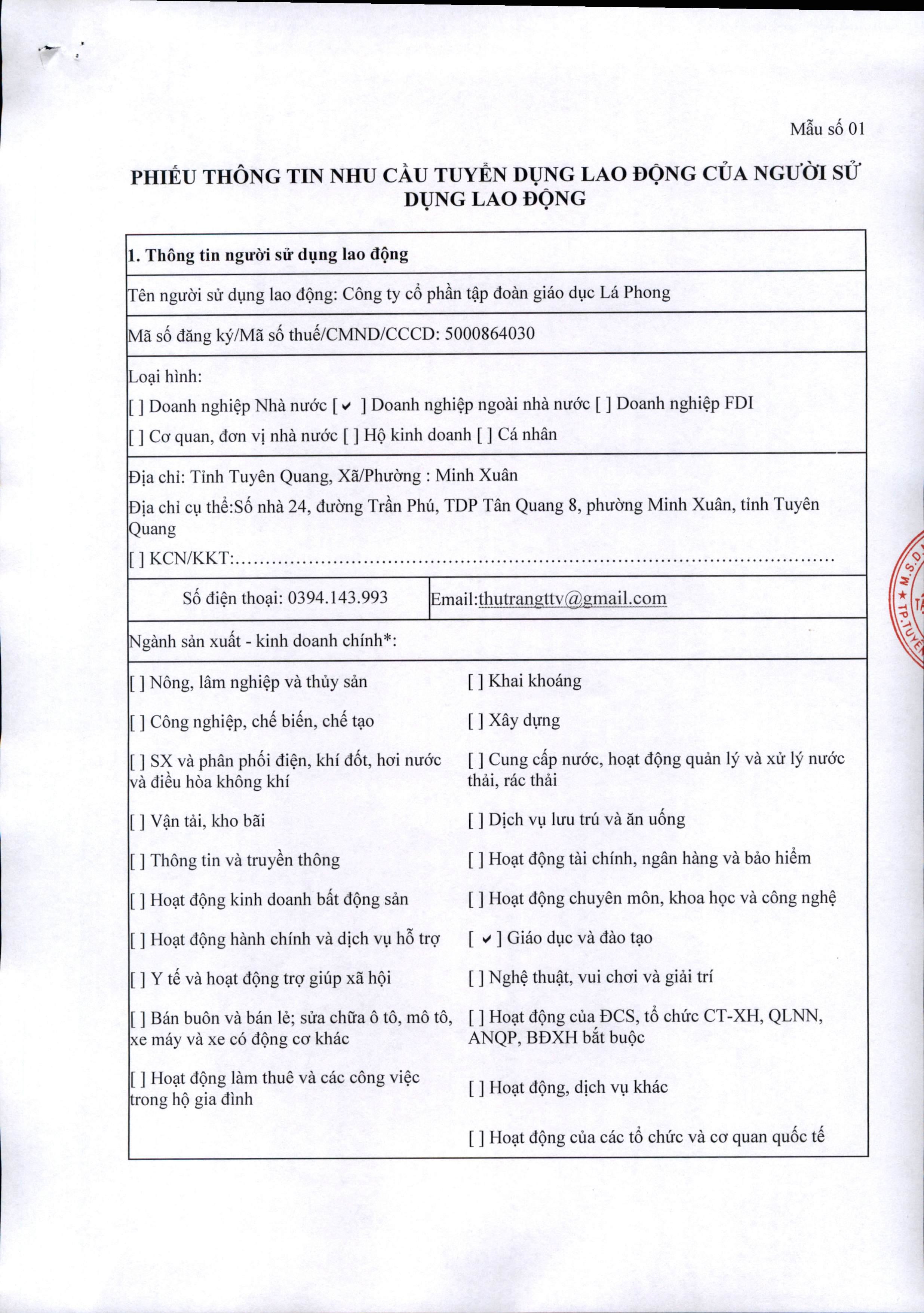 THÔNG BÁO NHU CẦU TUYỂN DỤNG LAO ĐỘNG CỦA CÔNG TY CỔ PHẦN TẬP ĐOÀN GIÁO DỤC LÁ PHONG