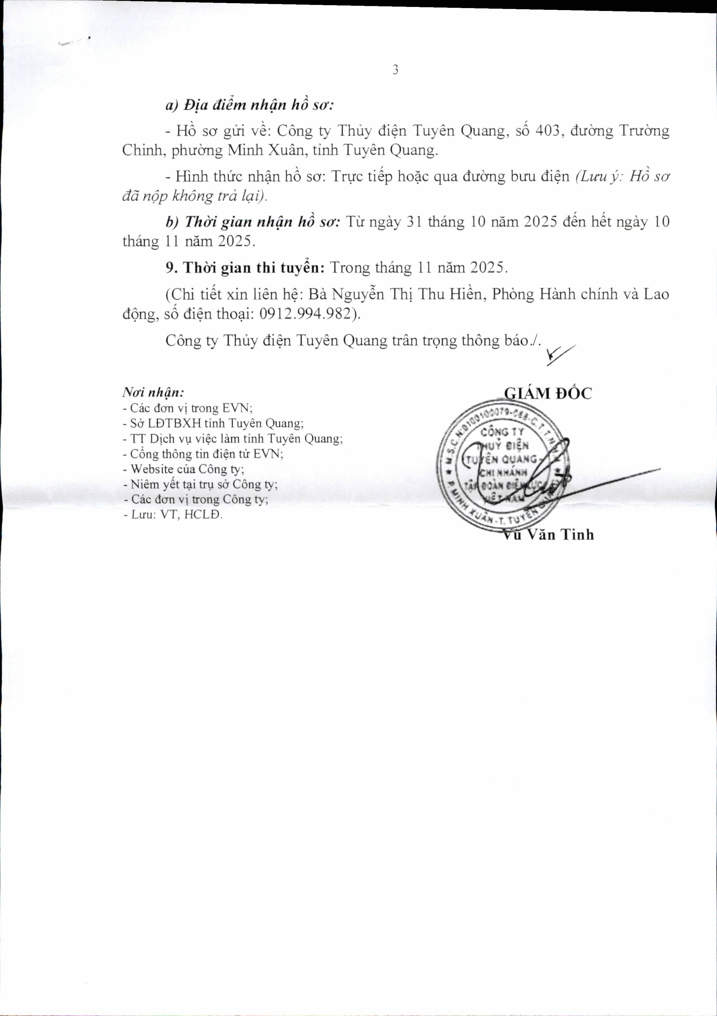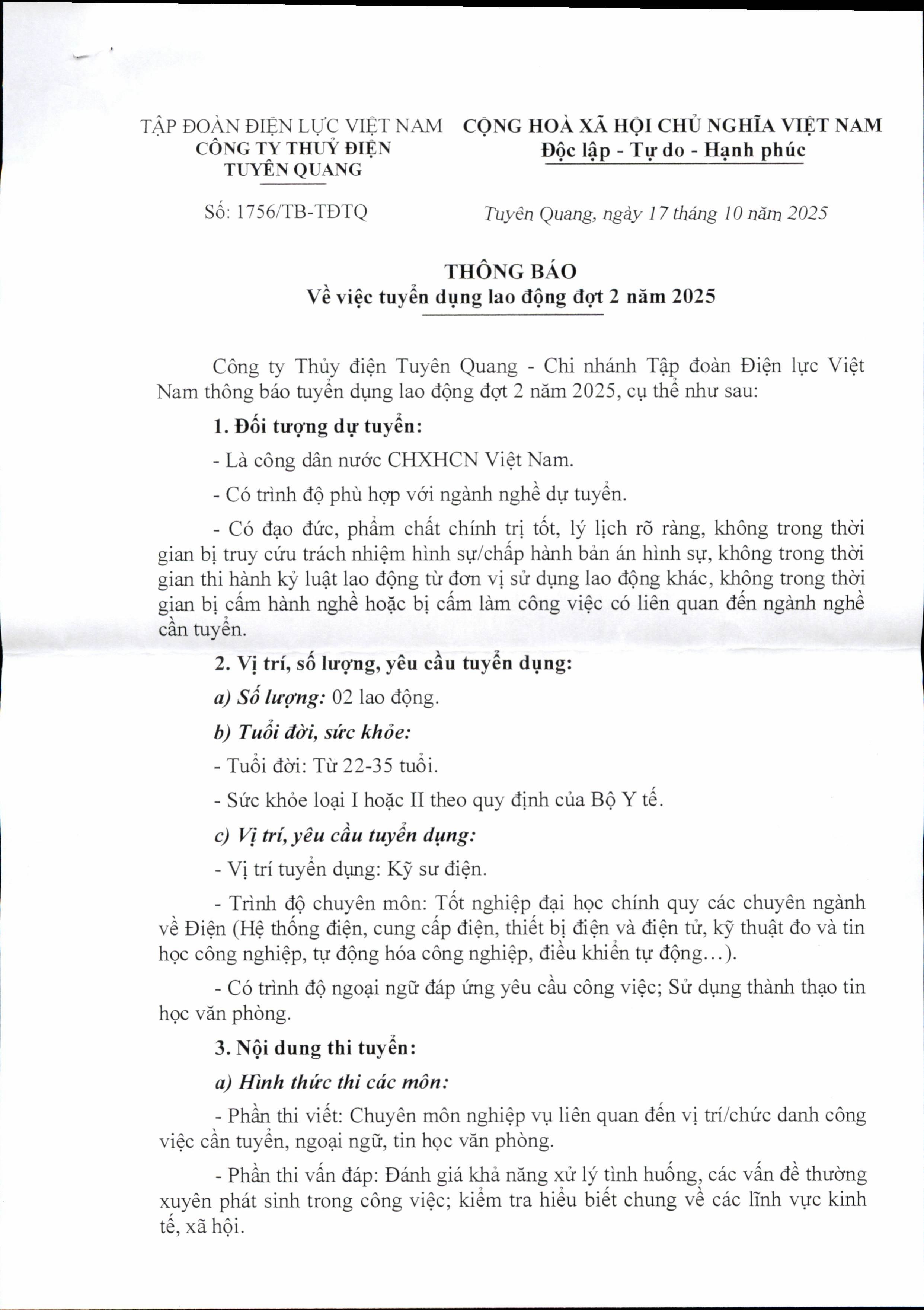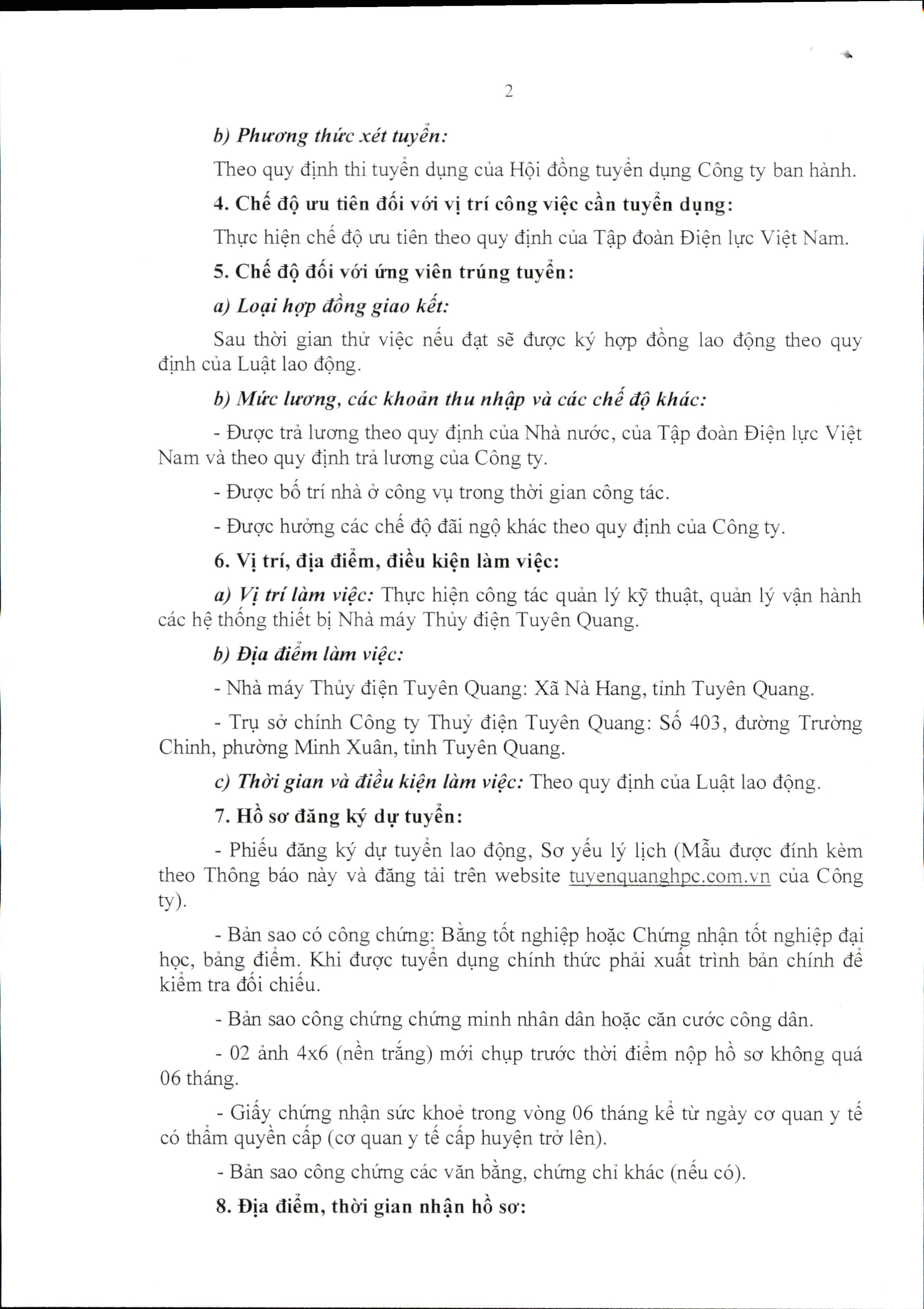 THÔNG BÁO NHU CẦU TUYỂN DỤNG LAO ĐỘNG CỦA CÔNG TY THỦY ĐIỆN TUYÊN QUANG