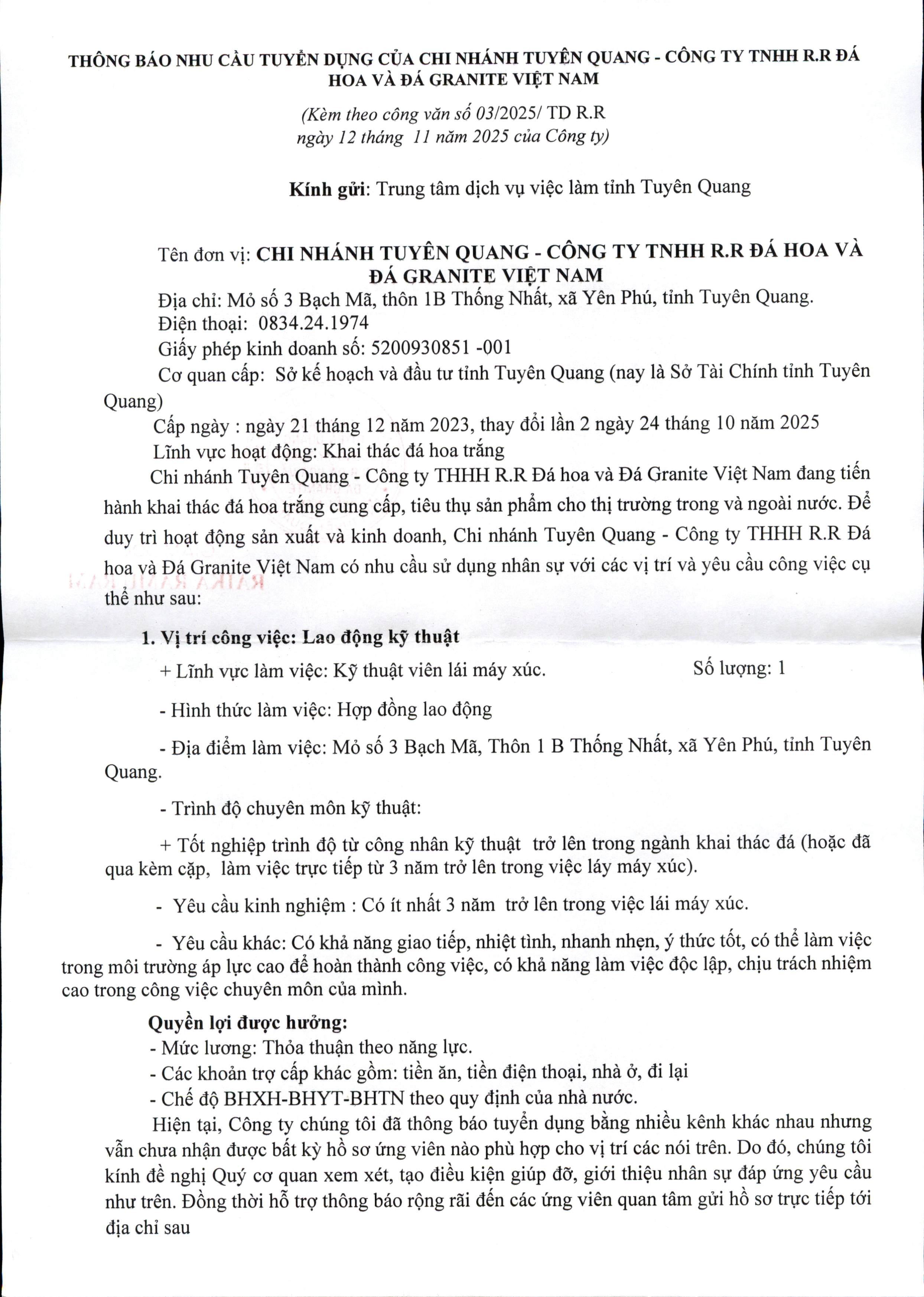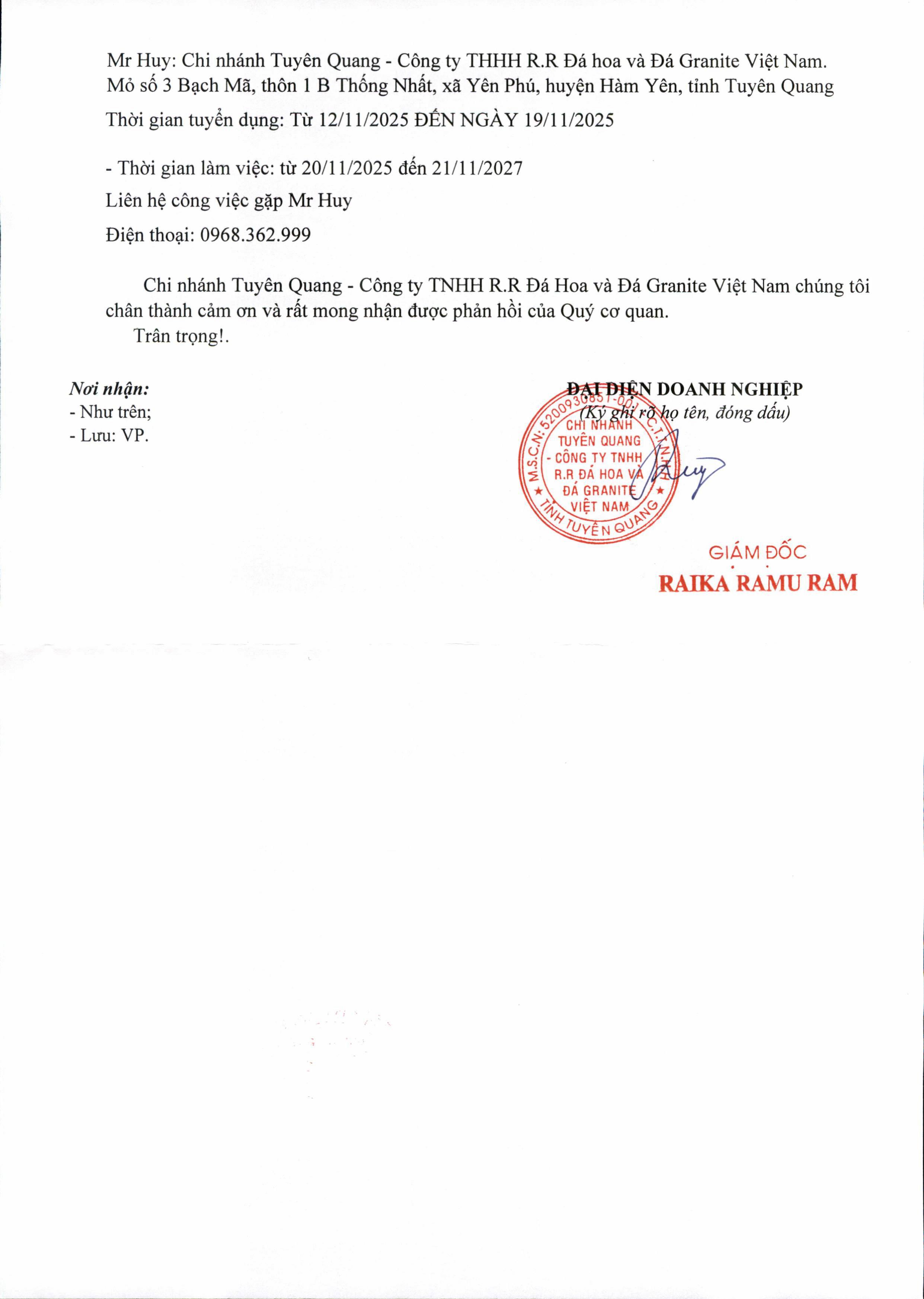 THÔNG BÁO NHU CẦU TUYỂN DỤNG LAO ĐỘNG CỦA CÔNG TY TNHH R.R ĐÁ HOA VÀ ĐÁ GRANITE VIỆT NAM