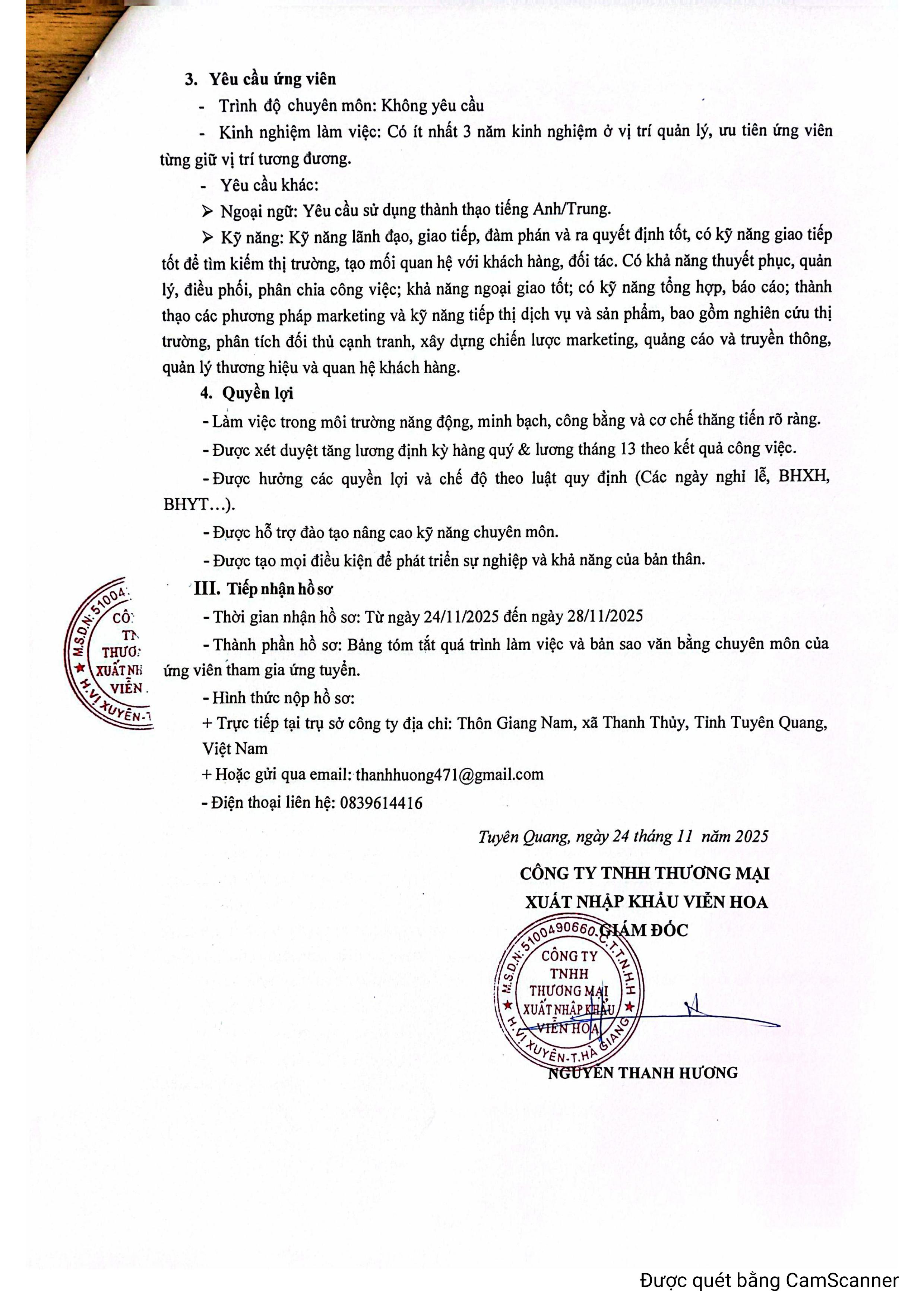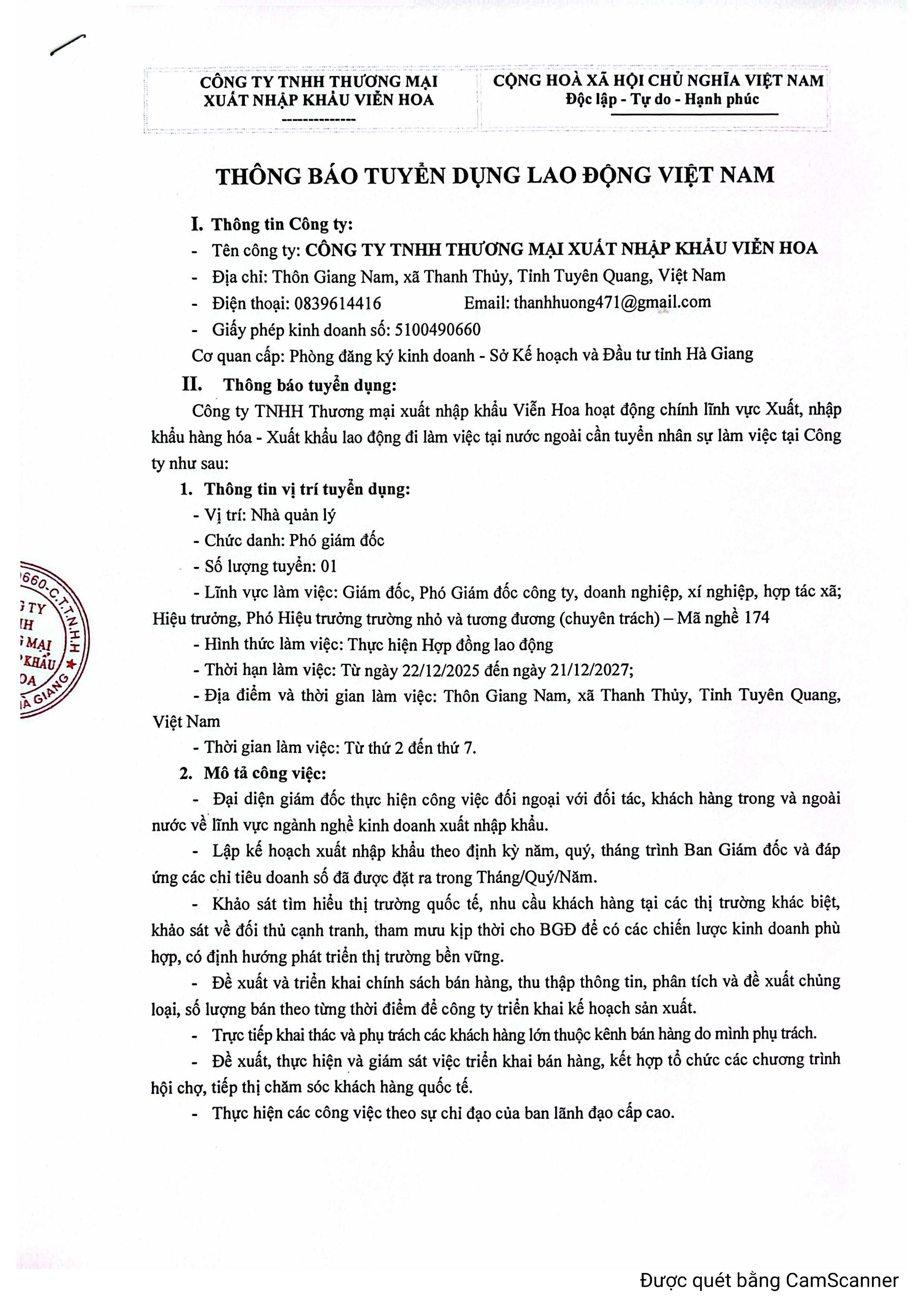 CÔNG TY TNHH THƯƠNG MẠI XUẤT KHẨU VIỄN HOA THÔNG BÁO NHU CẦU TUYỂN DỤNG LAO ĐỘNG