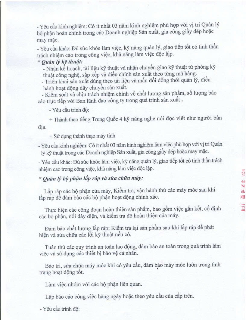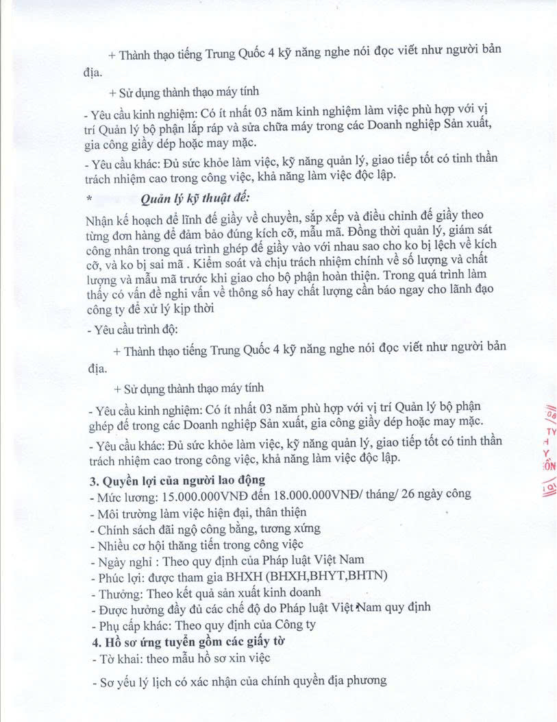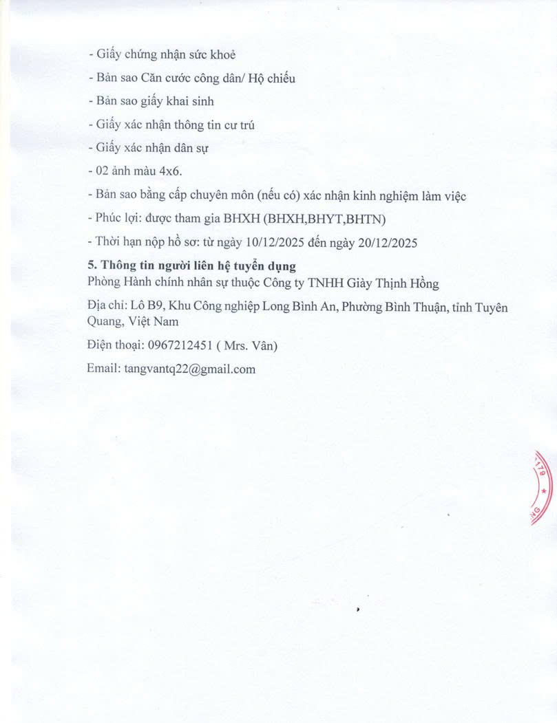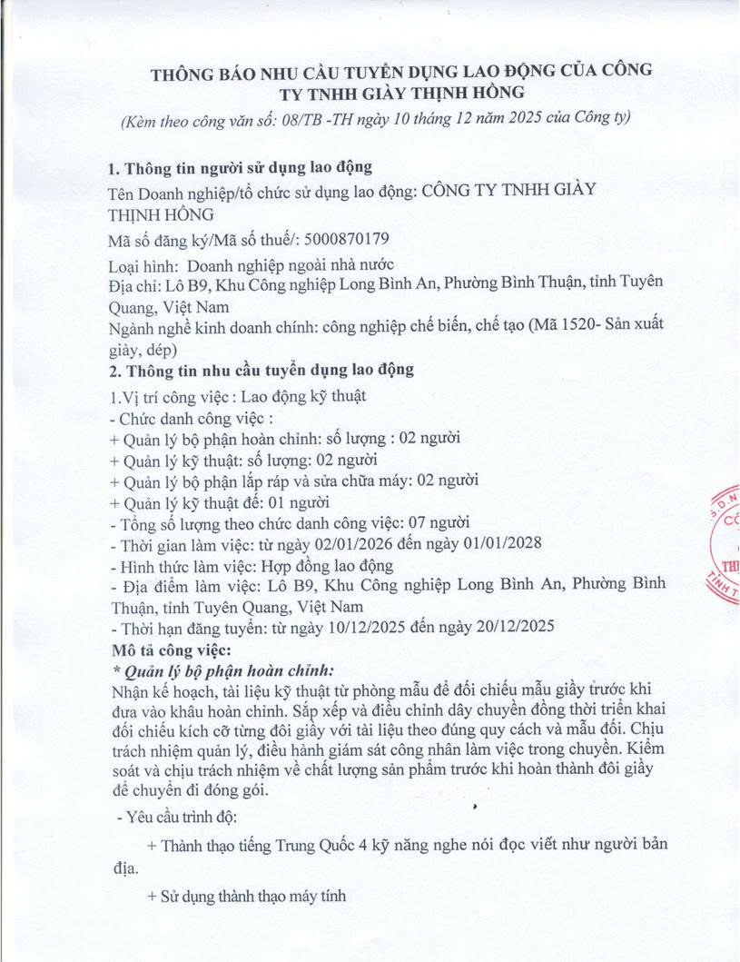 CÔNG TY TNHH GIẦY THỊNH HỒNG THÔNG BÁO TUYỂN DỤNG