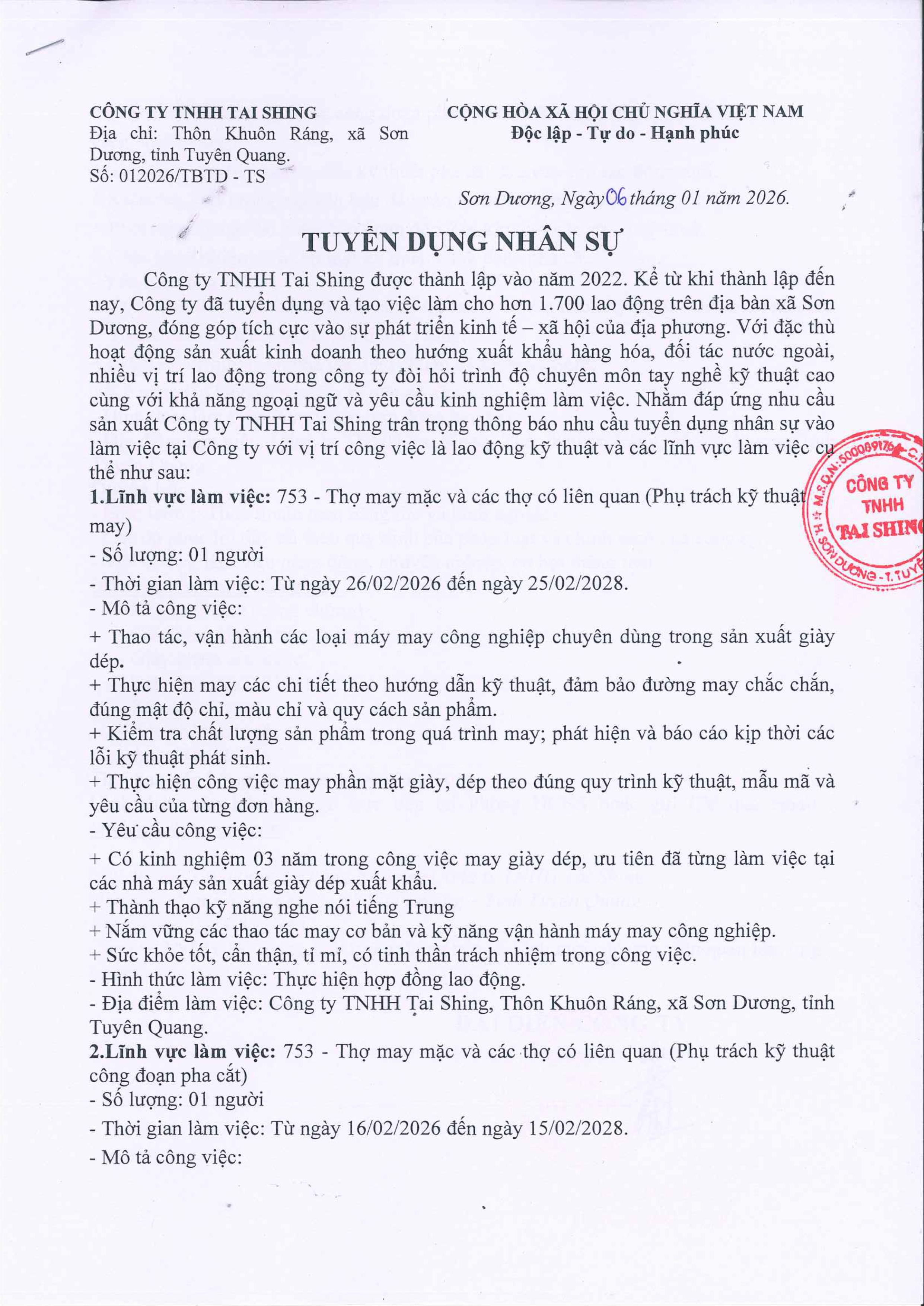 CÔNG TY TNHH TAI SHING THÔNG BÁO TUYỂN DỤNG
