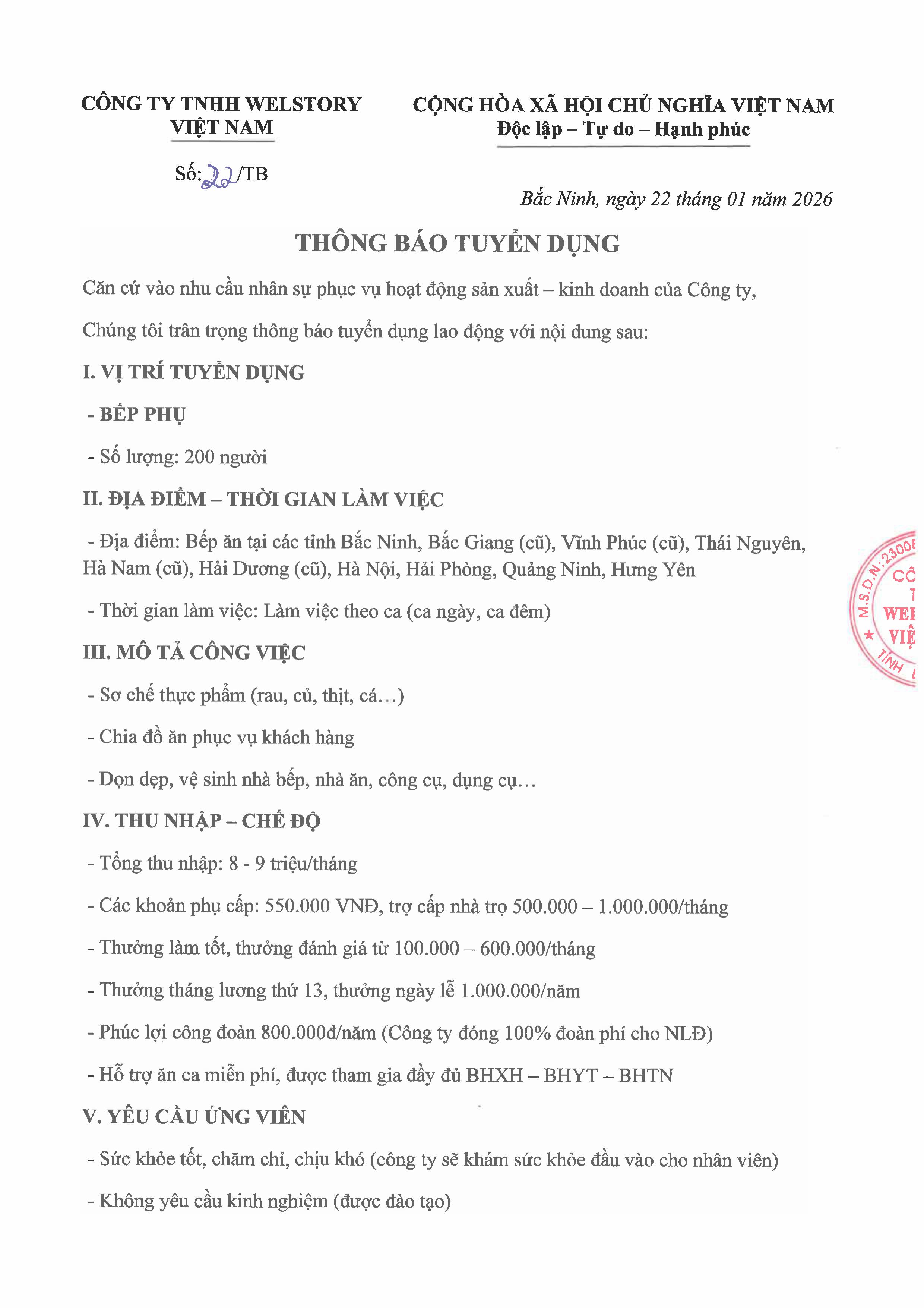 CÔNG TY TNHH WELSTORY VIỆT NAM THÔNG BÁO TUYỂN DỤNG