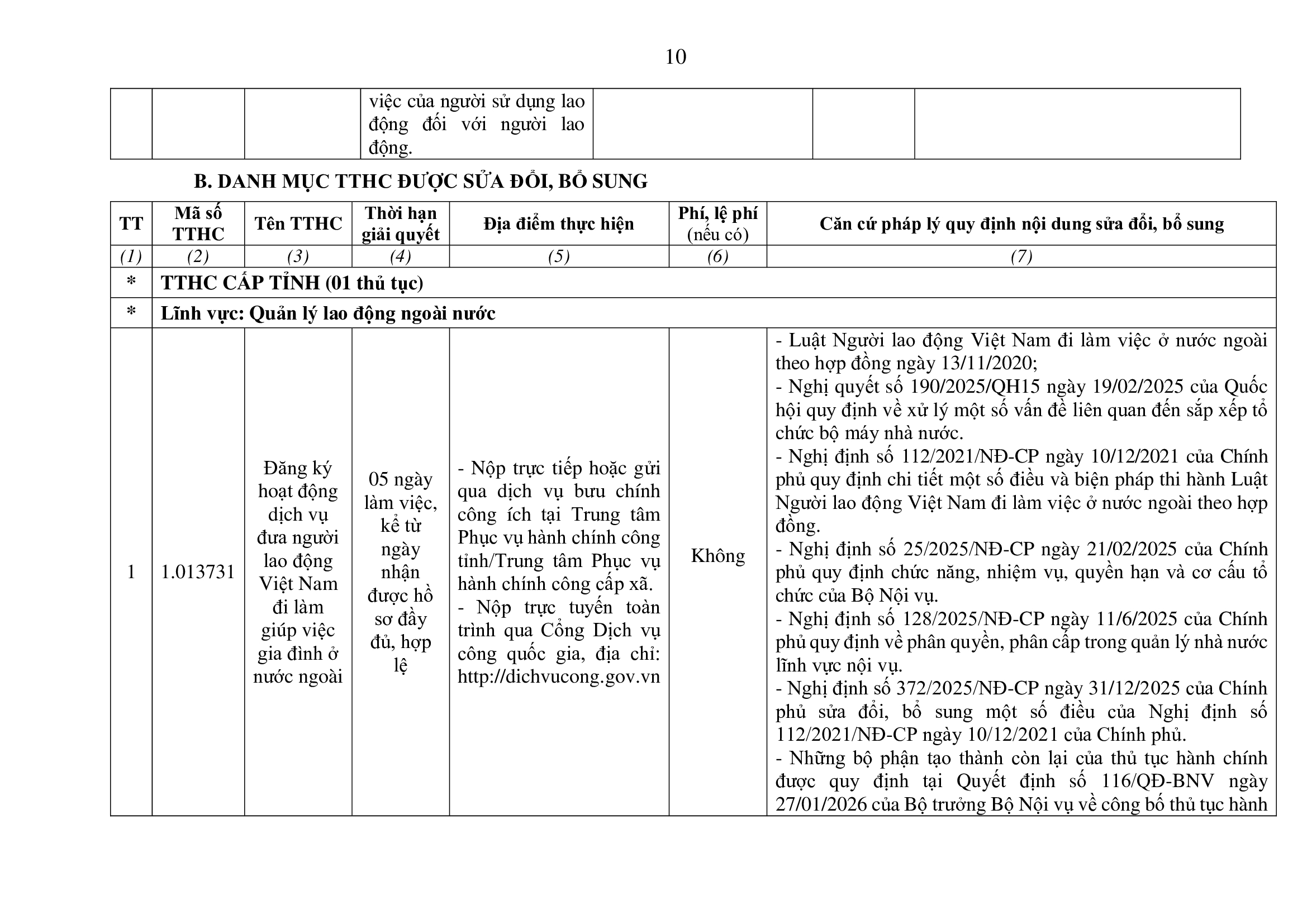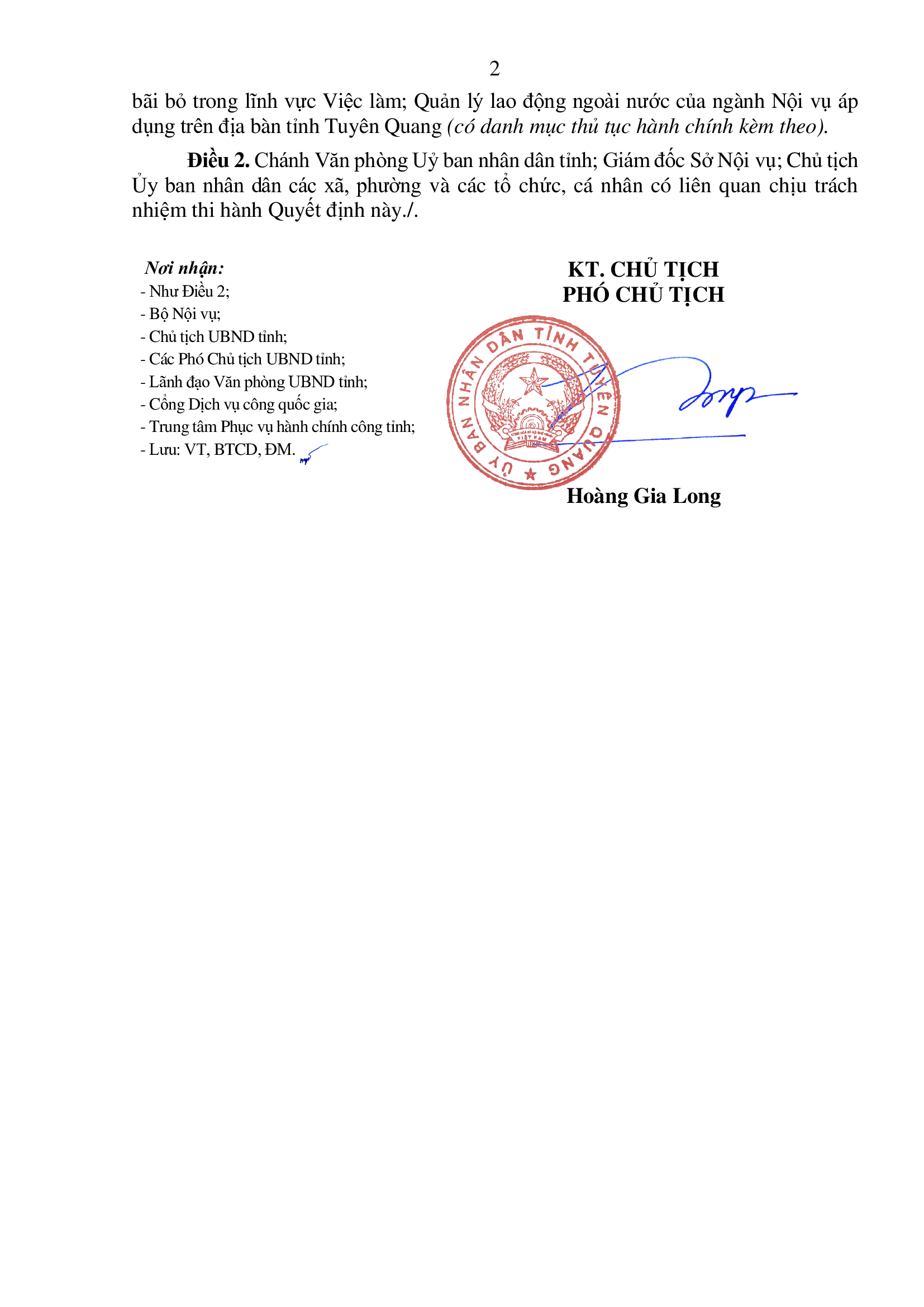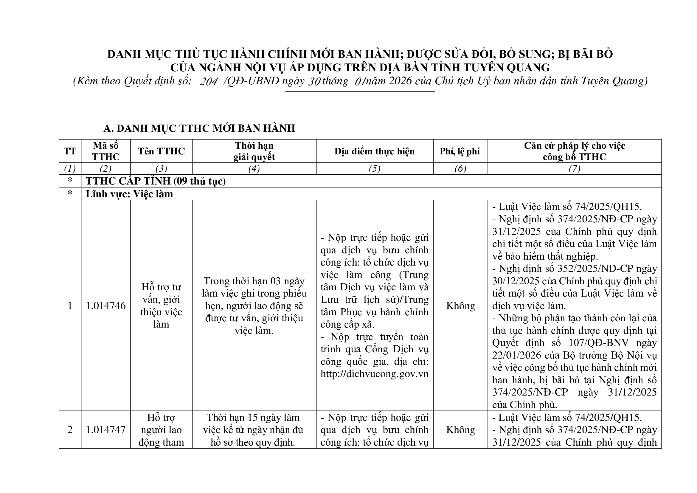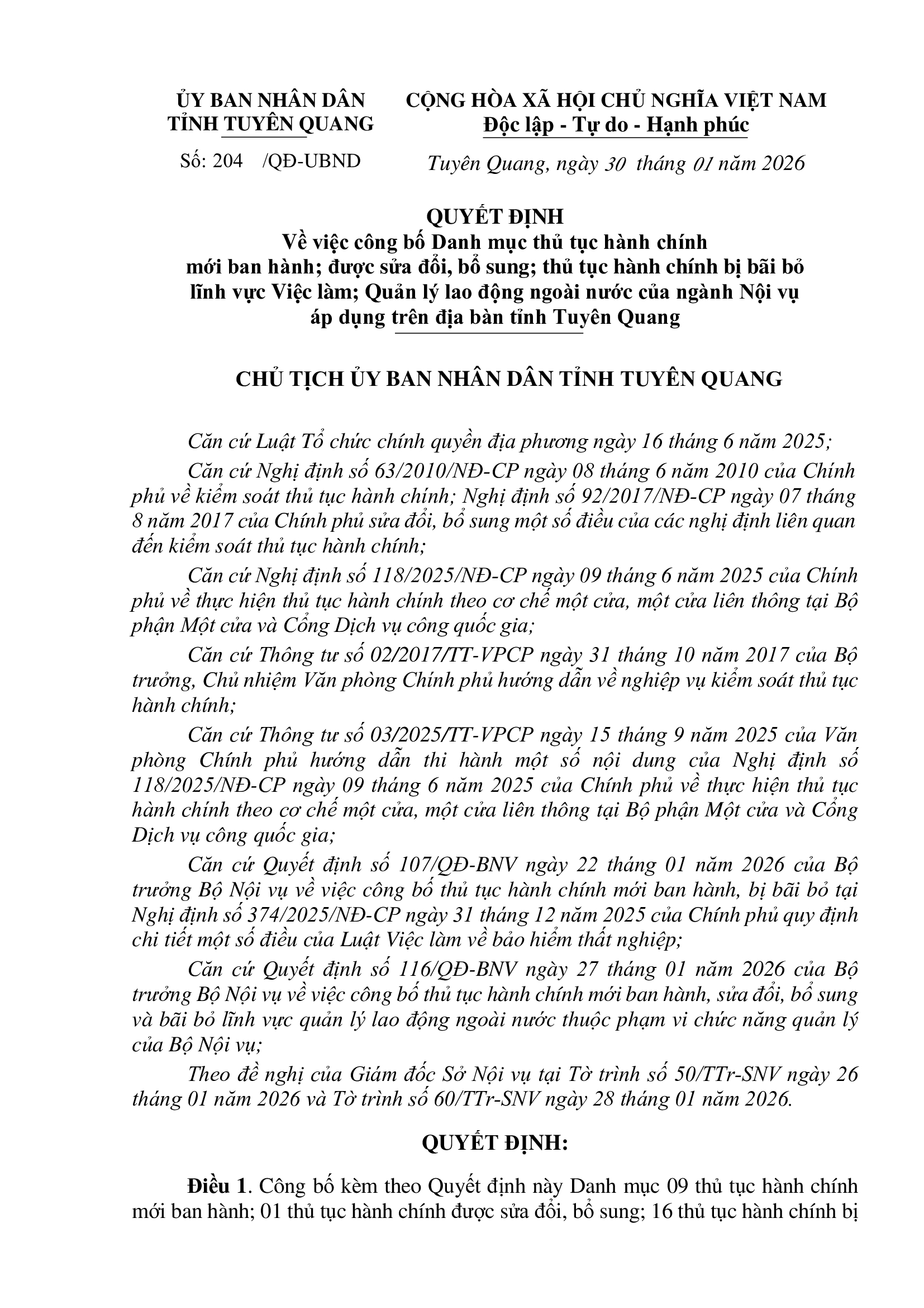 Công bố Danh mục thủ tục hành chính mới ban hành; được sửa đổi, bổ sung; thủ tục hành chính bị bãi bỏ lĩnh vực Việc làm; Quản lý lao động ngoài nước của ngành Nội vụ áp dụng trên địa bàn tỉnh Tuyên Quang