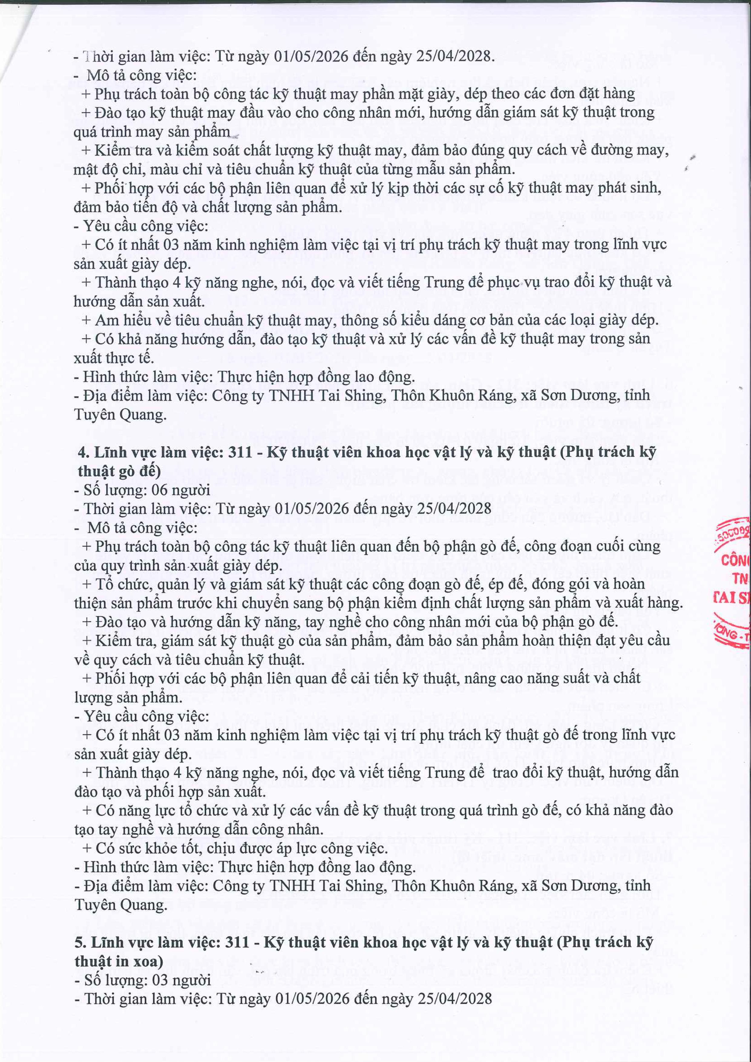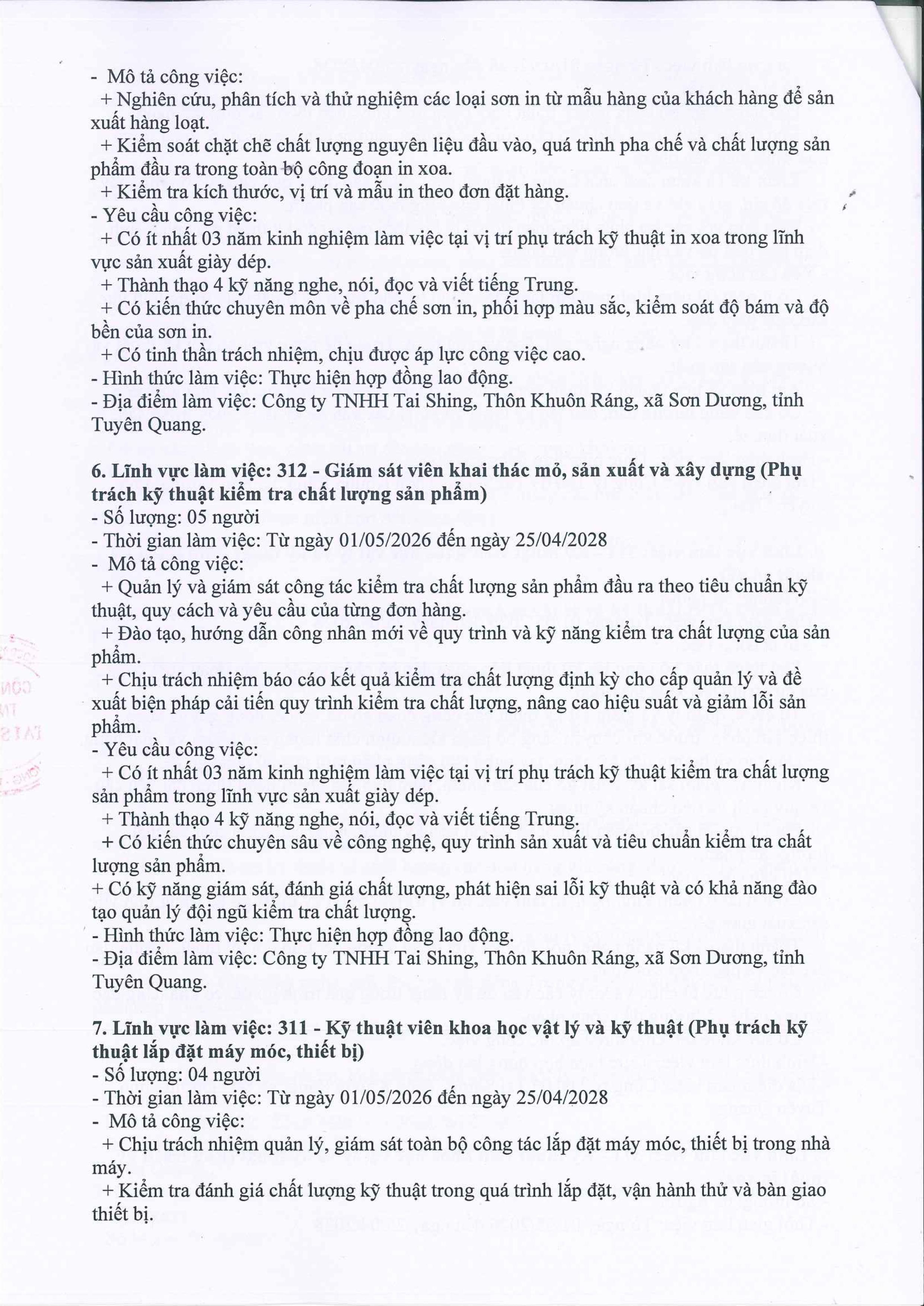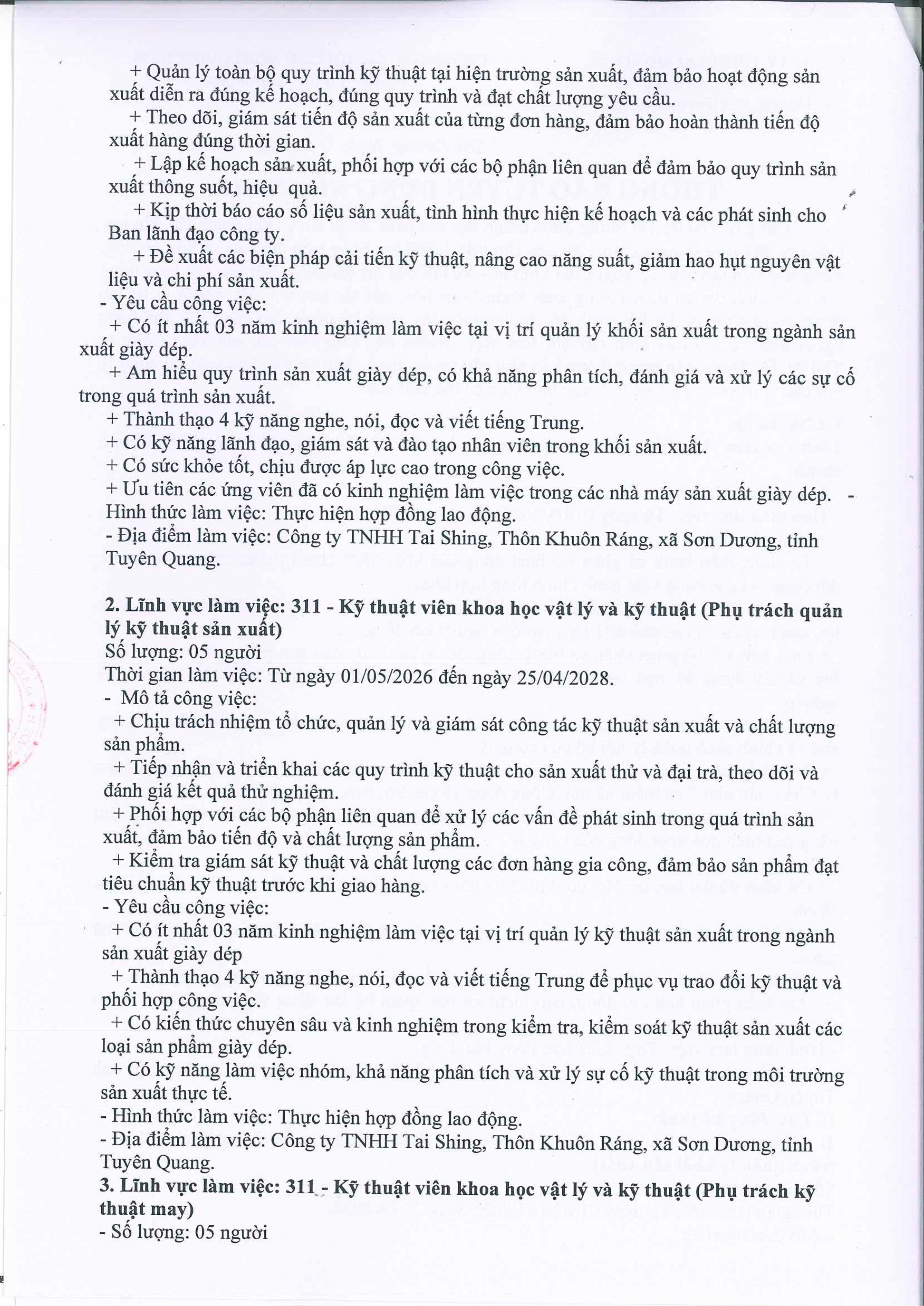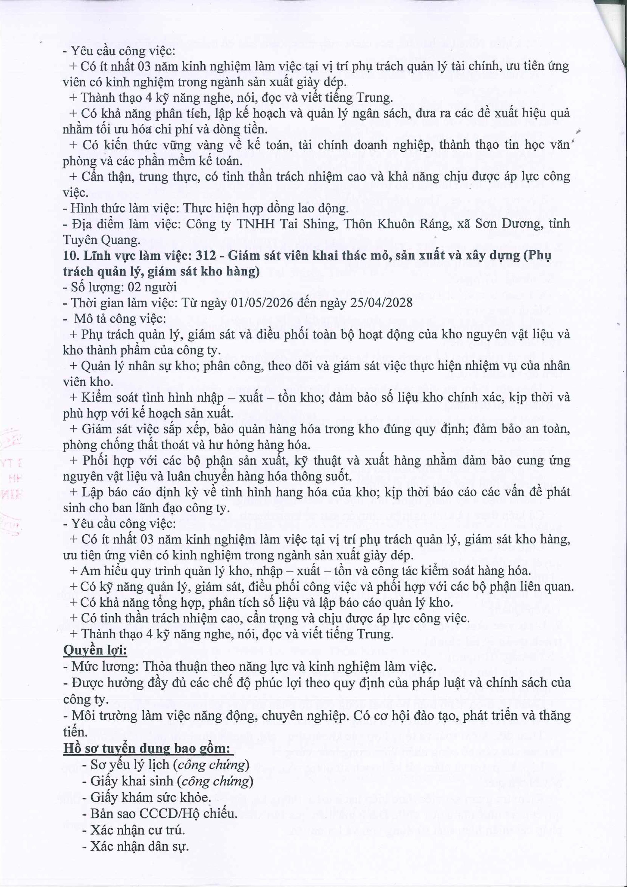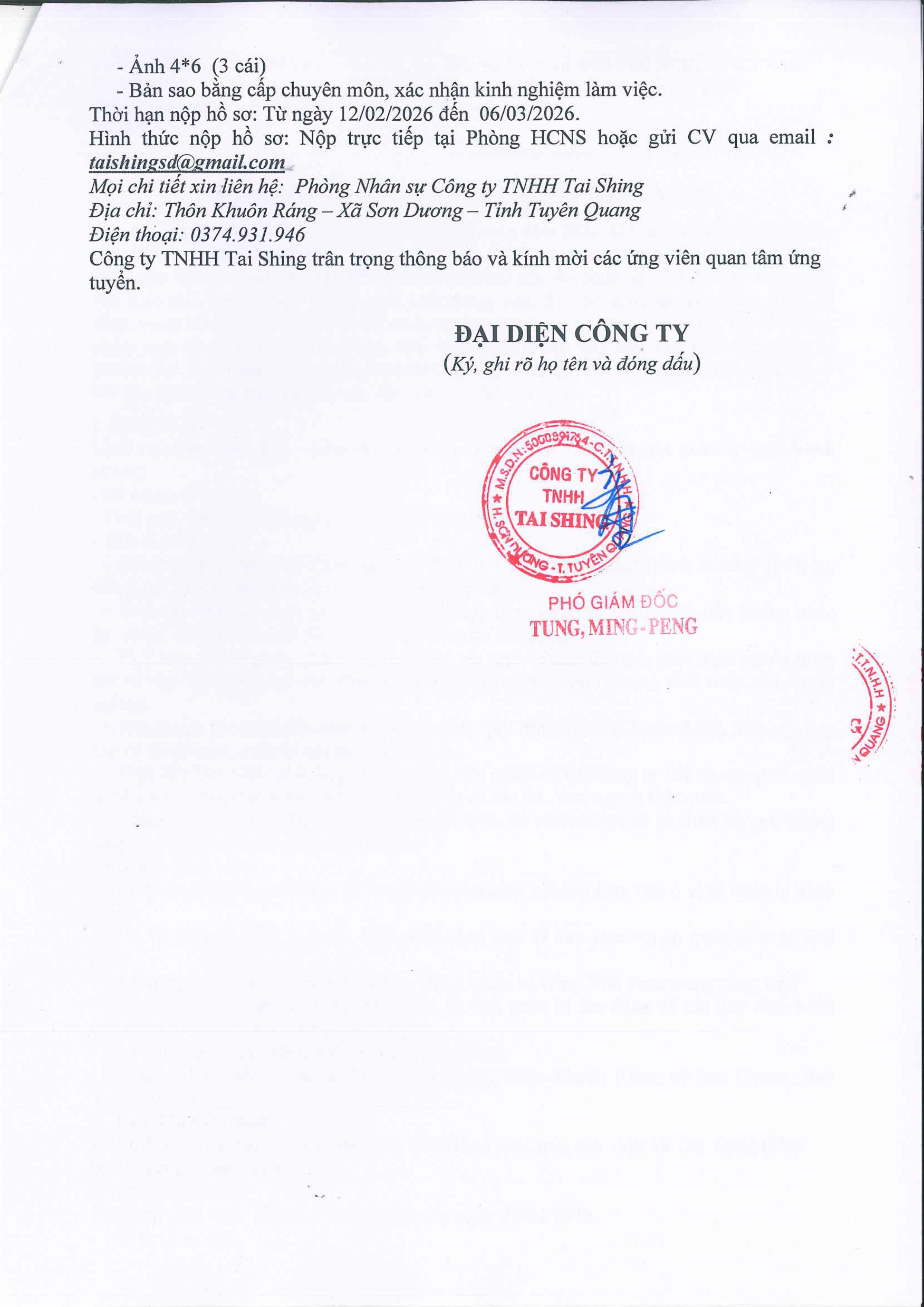 CÔNG TY TNHH TAI SHING THÔNG BÁO TUYỂN DỤNG