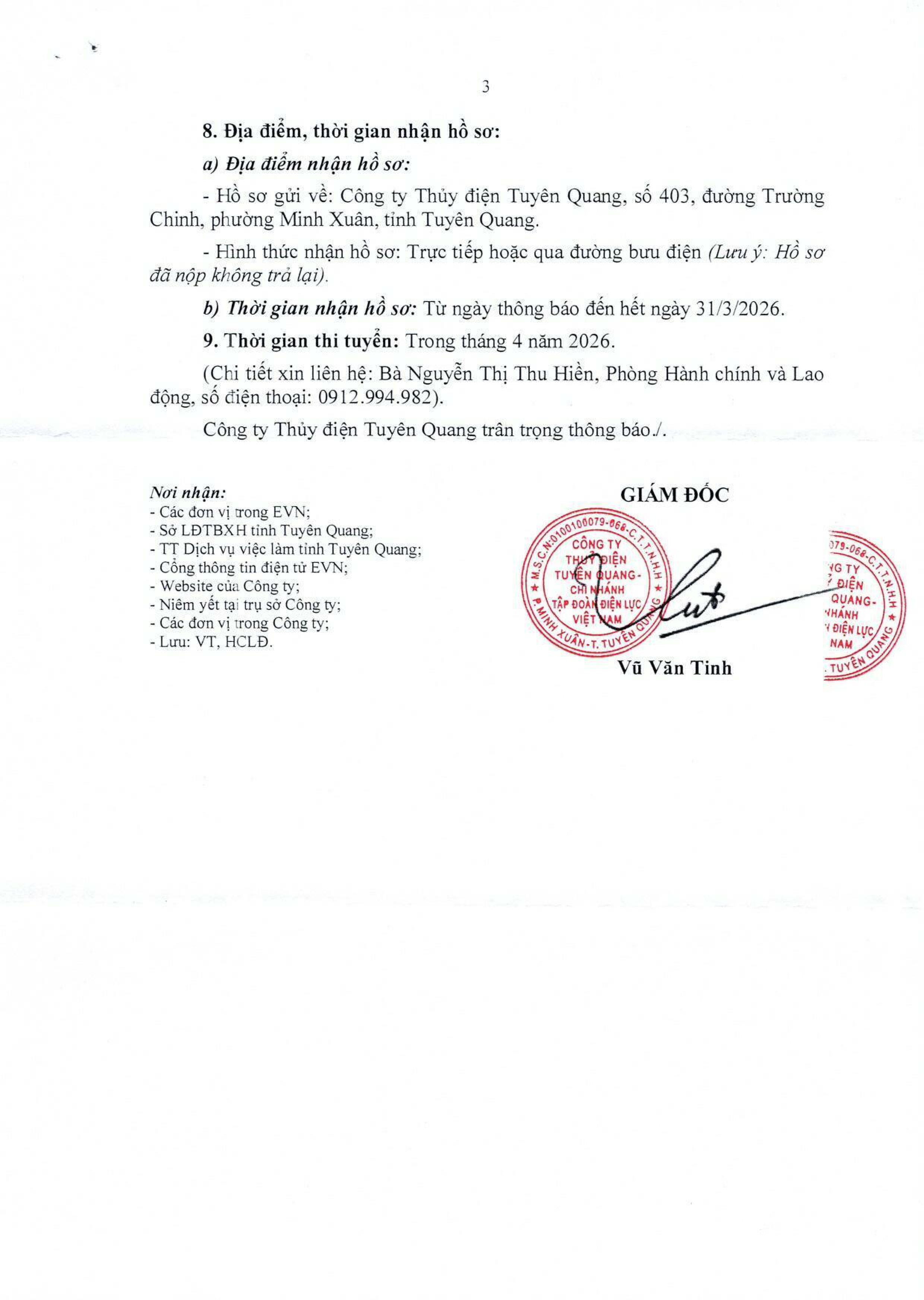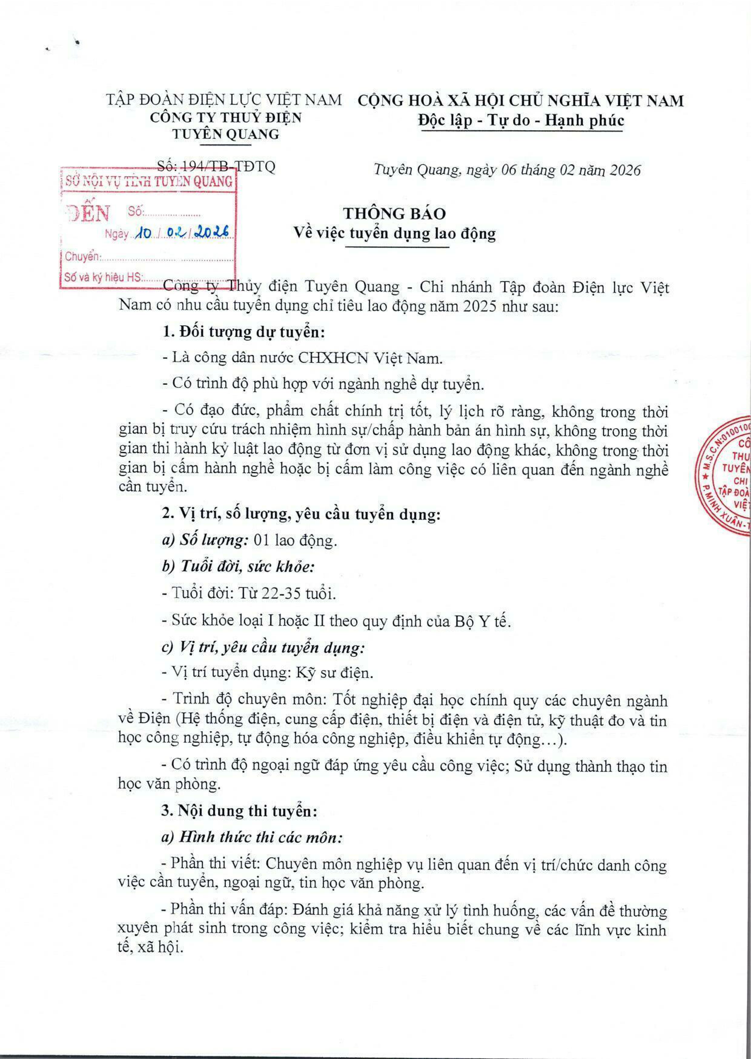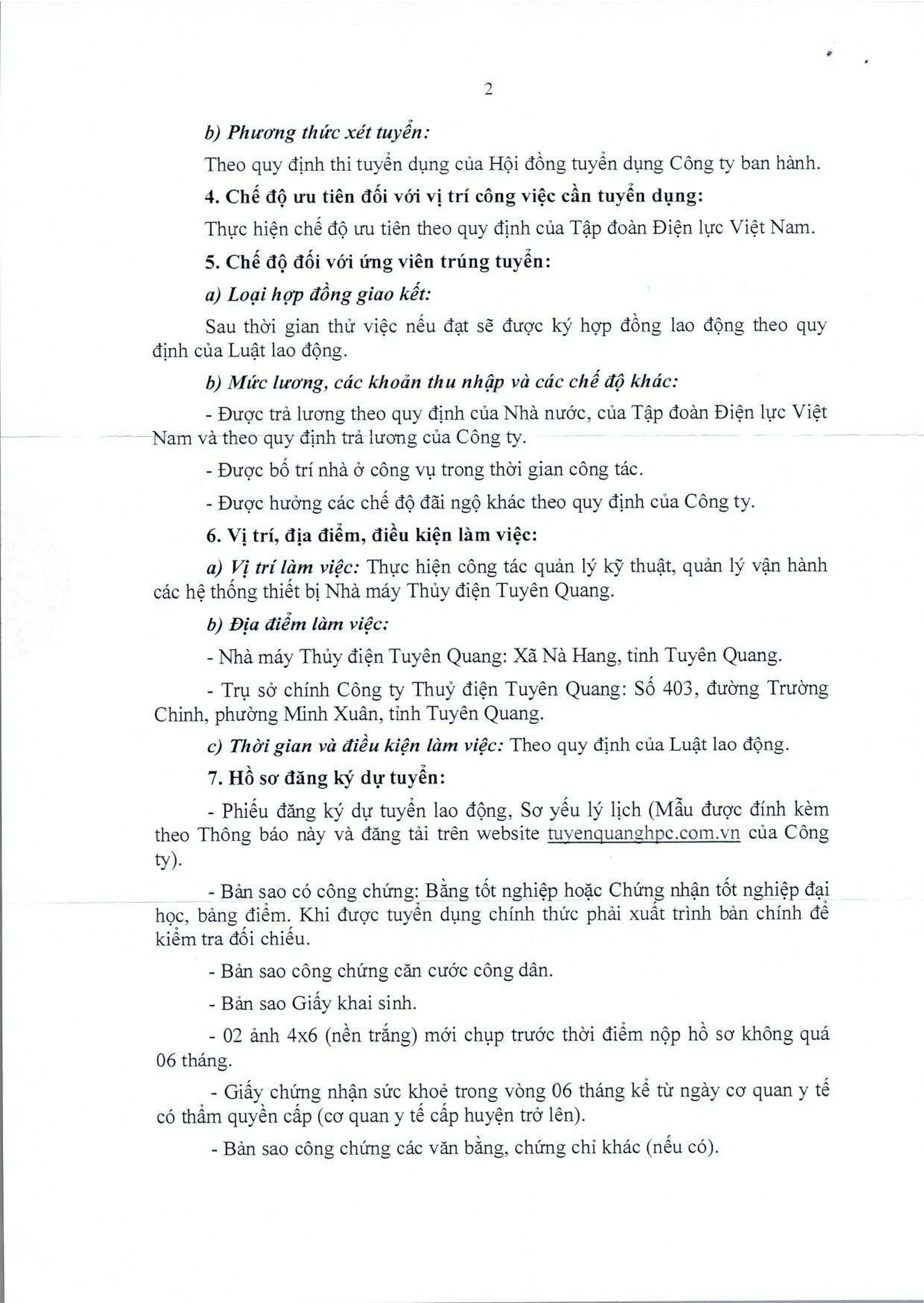 CÔNG TY THỦY ĐIỆN TUYÊN QUANG THÔNG BÁO TUYỂN DỤNG