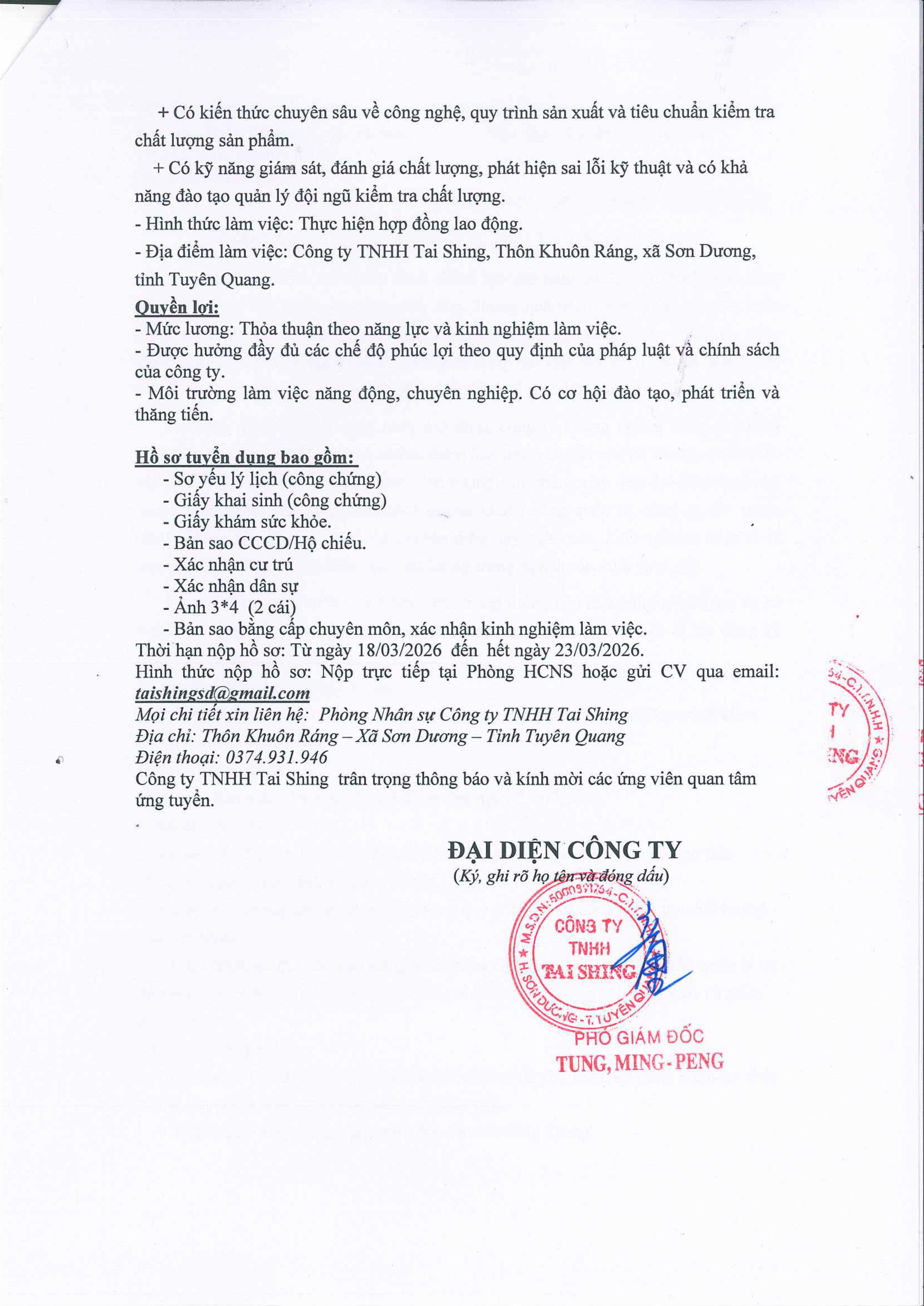 CÔNG TY TNHH TAI SING THÔNG BÁO TUYỂN DỤNG