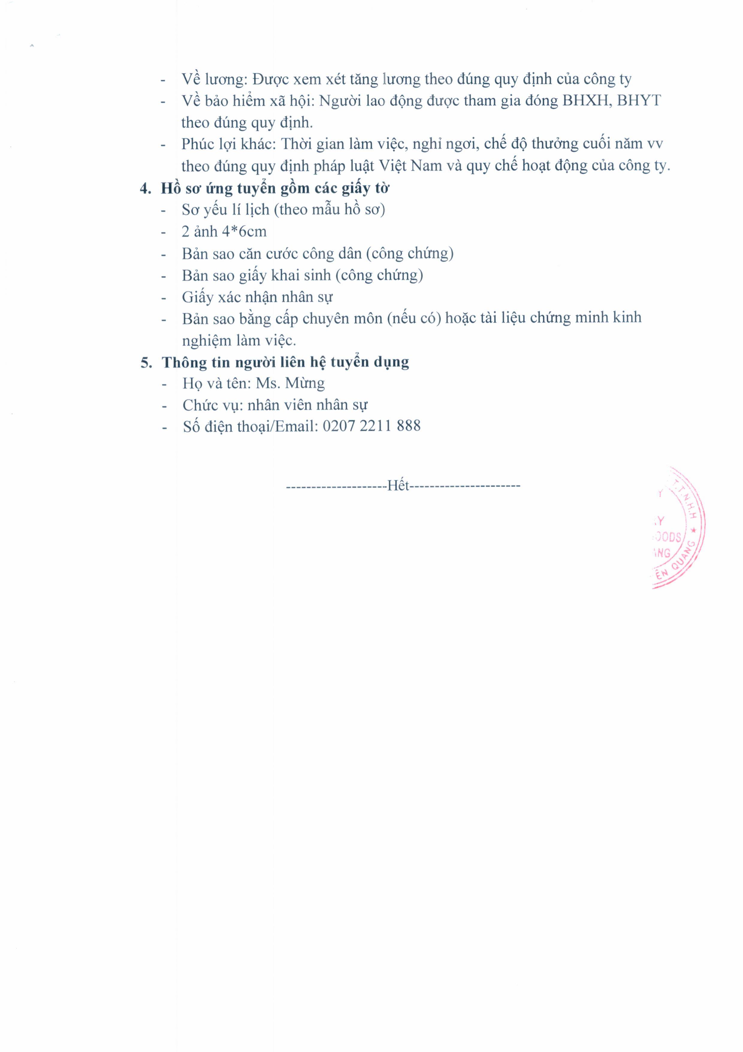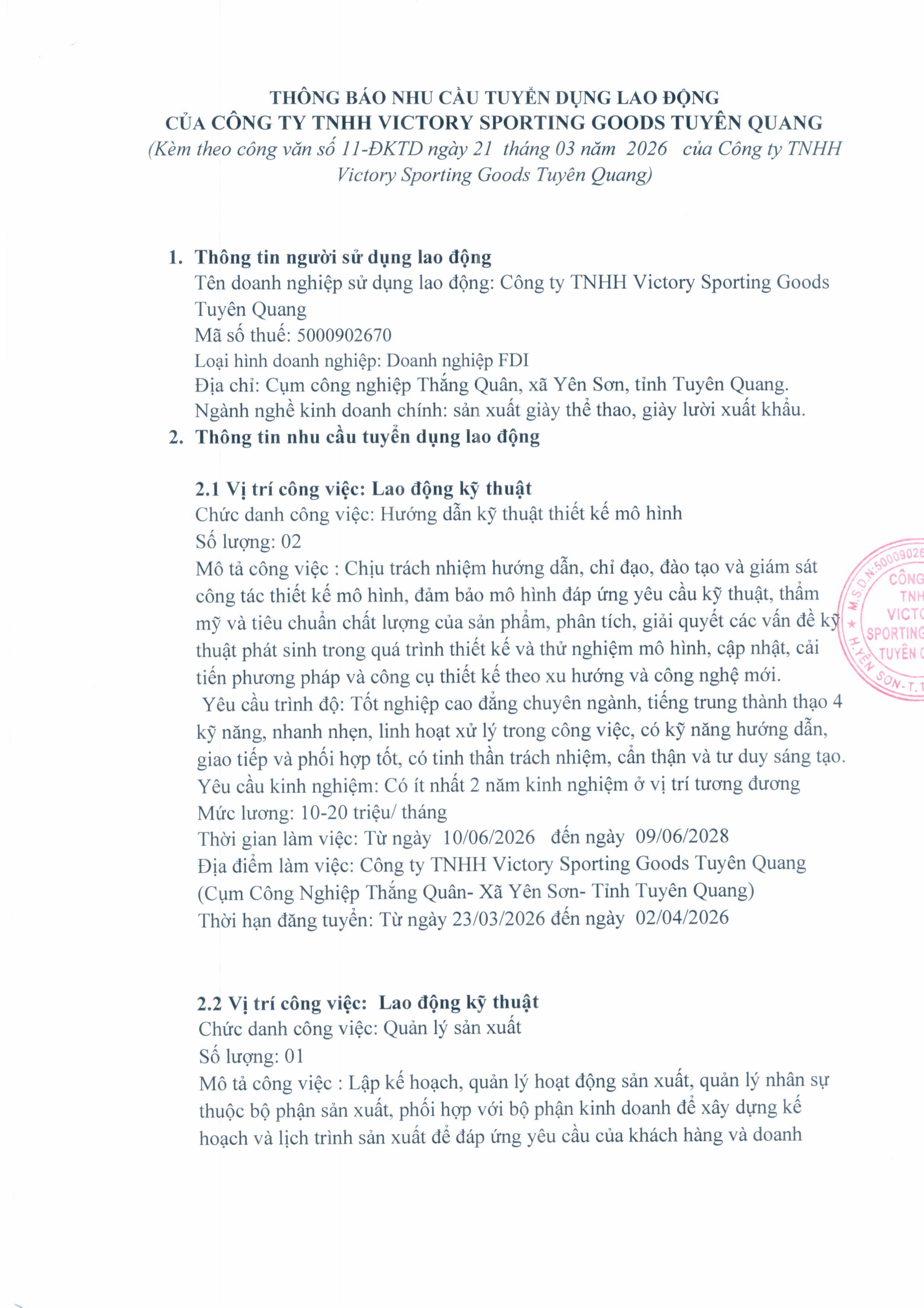 CÔNG TY TNHH VICTORY SPORTING GOODS TUYÊN QUANG THÔNG BÁO TUYỂN DỤNG