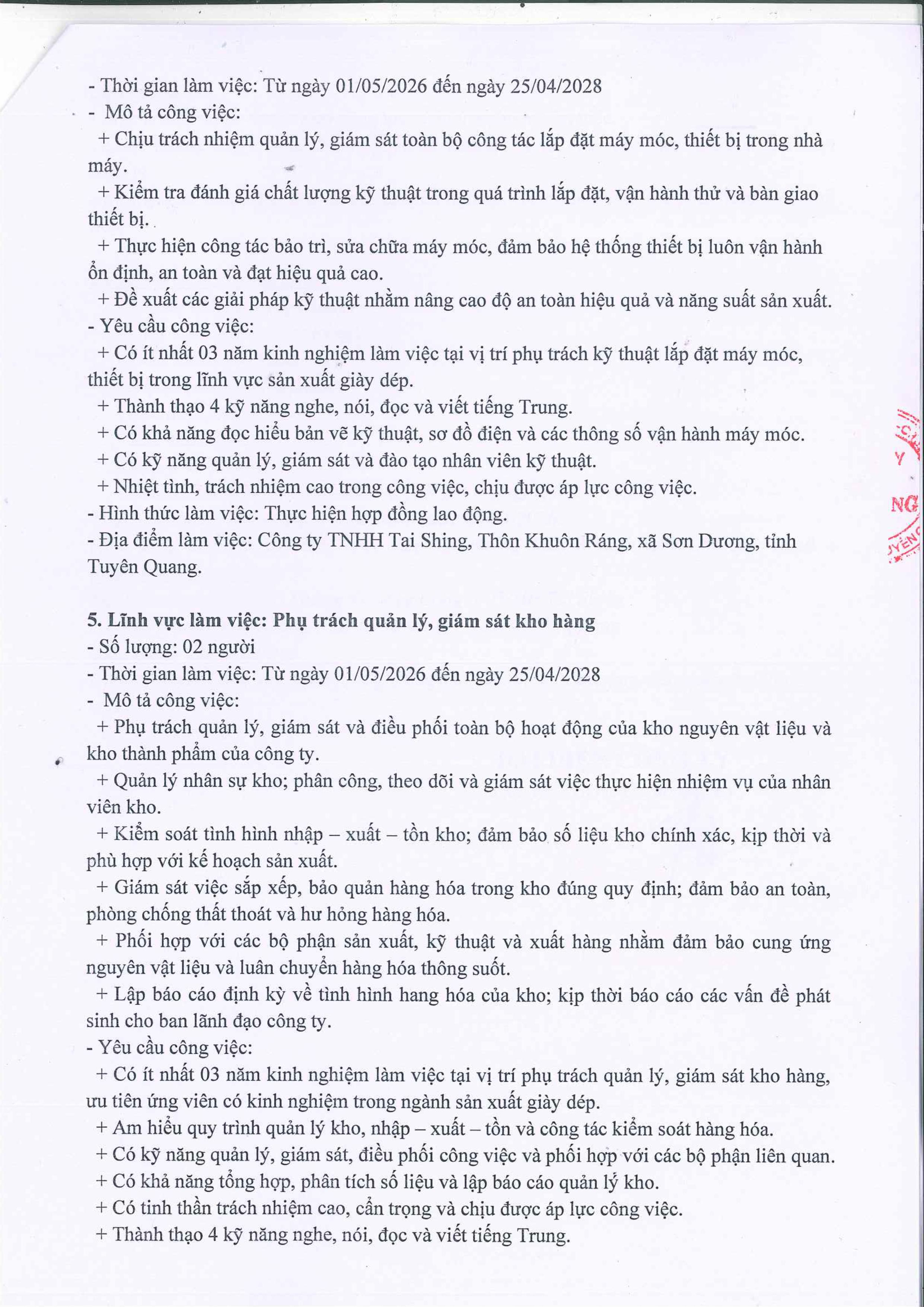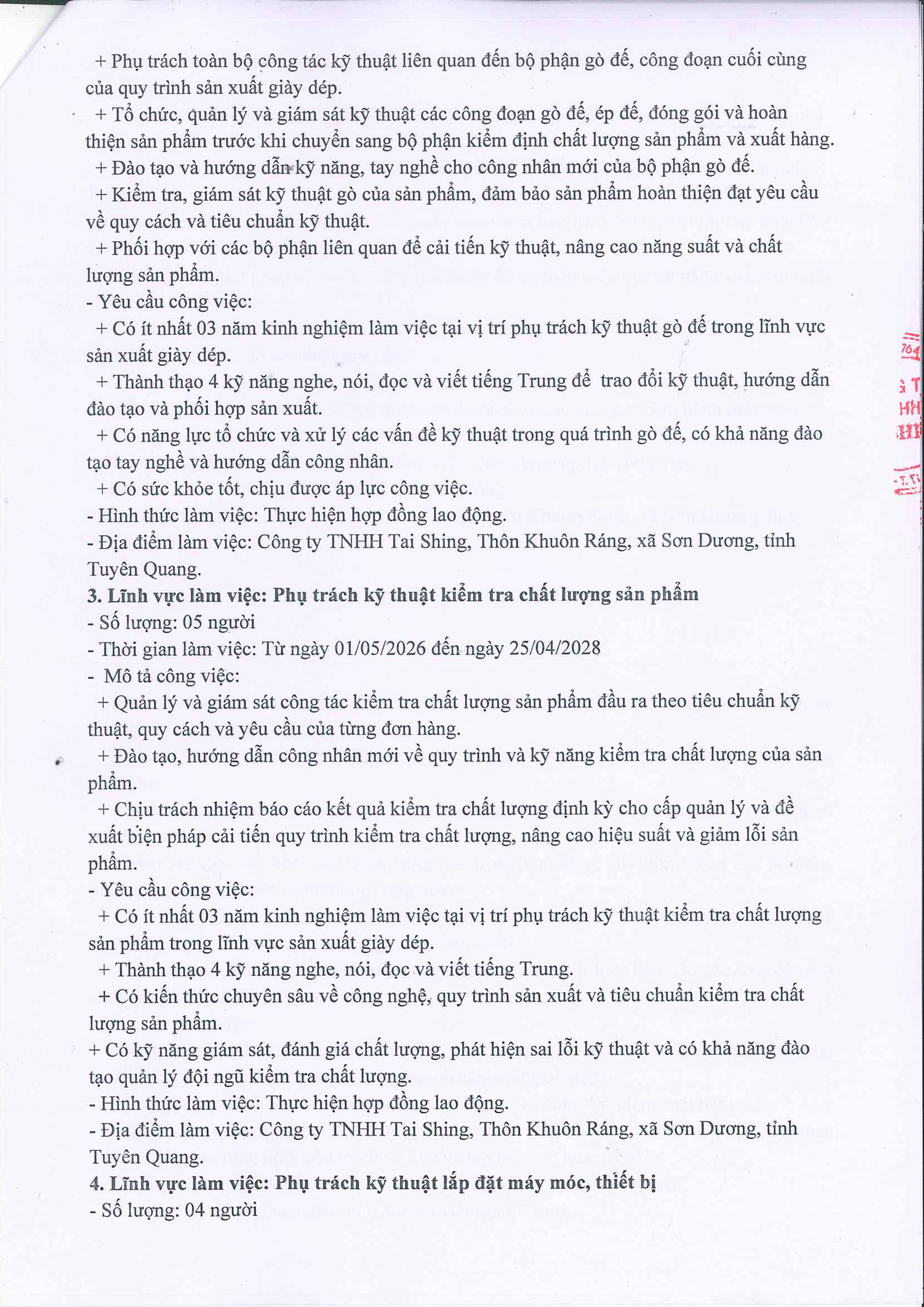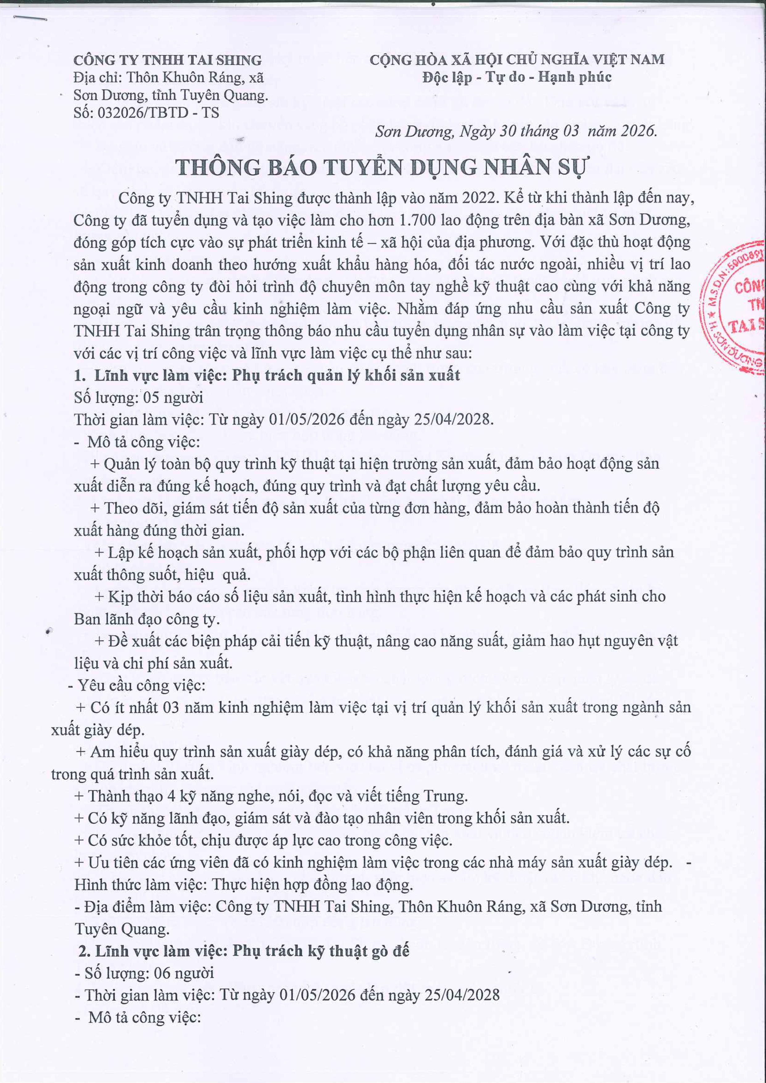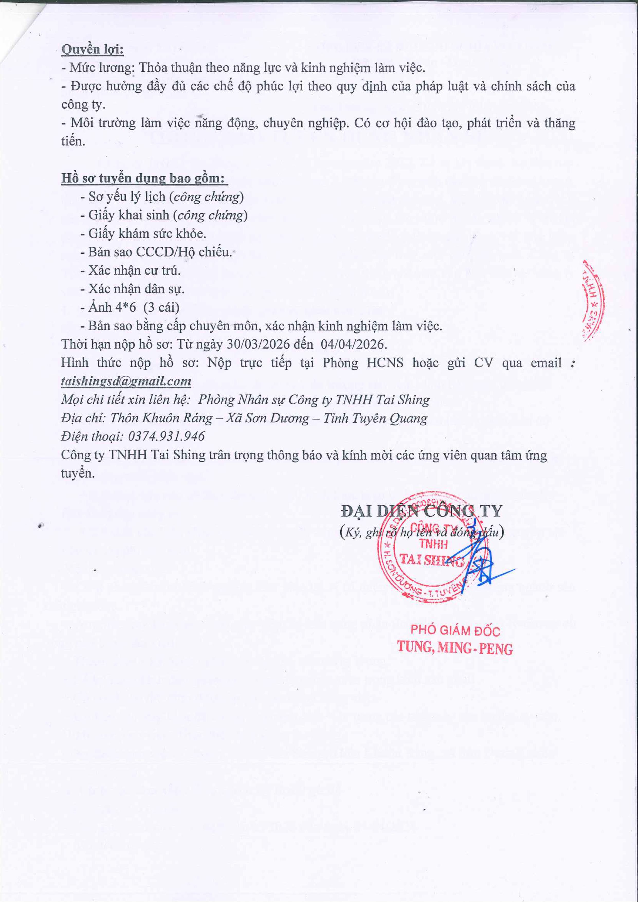 CÔNG TY TNHH TAI SHING THÔNG BÁO TUYỂN DỤNG