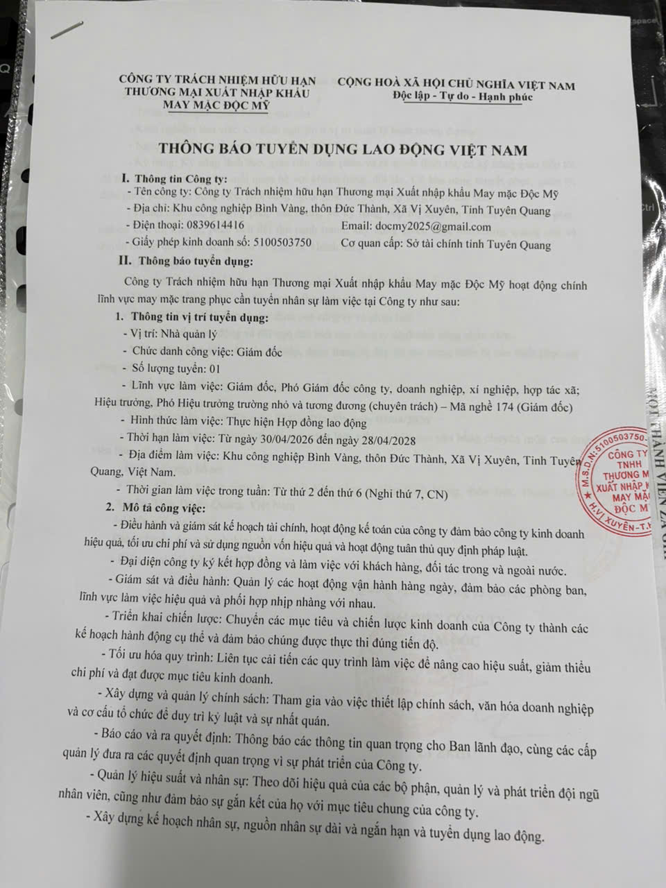 CÔNG TY TNHH THƯƠNG MẠI XUẤT KHẨU MAY MẶC ĐỘC MỸ THÔNG BÁO TUYỂN DỤNG