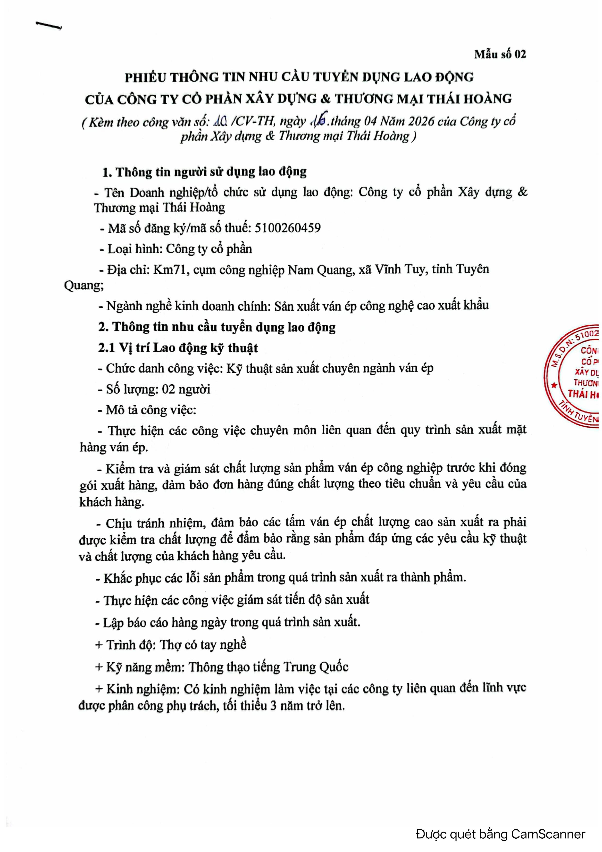 CÔNG TY CỔ PHẦN XÂY DỰNG & THƯƠNG MẠI THÁI HOÀNG THÔNG BÁO TUYỂN DỤNG