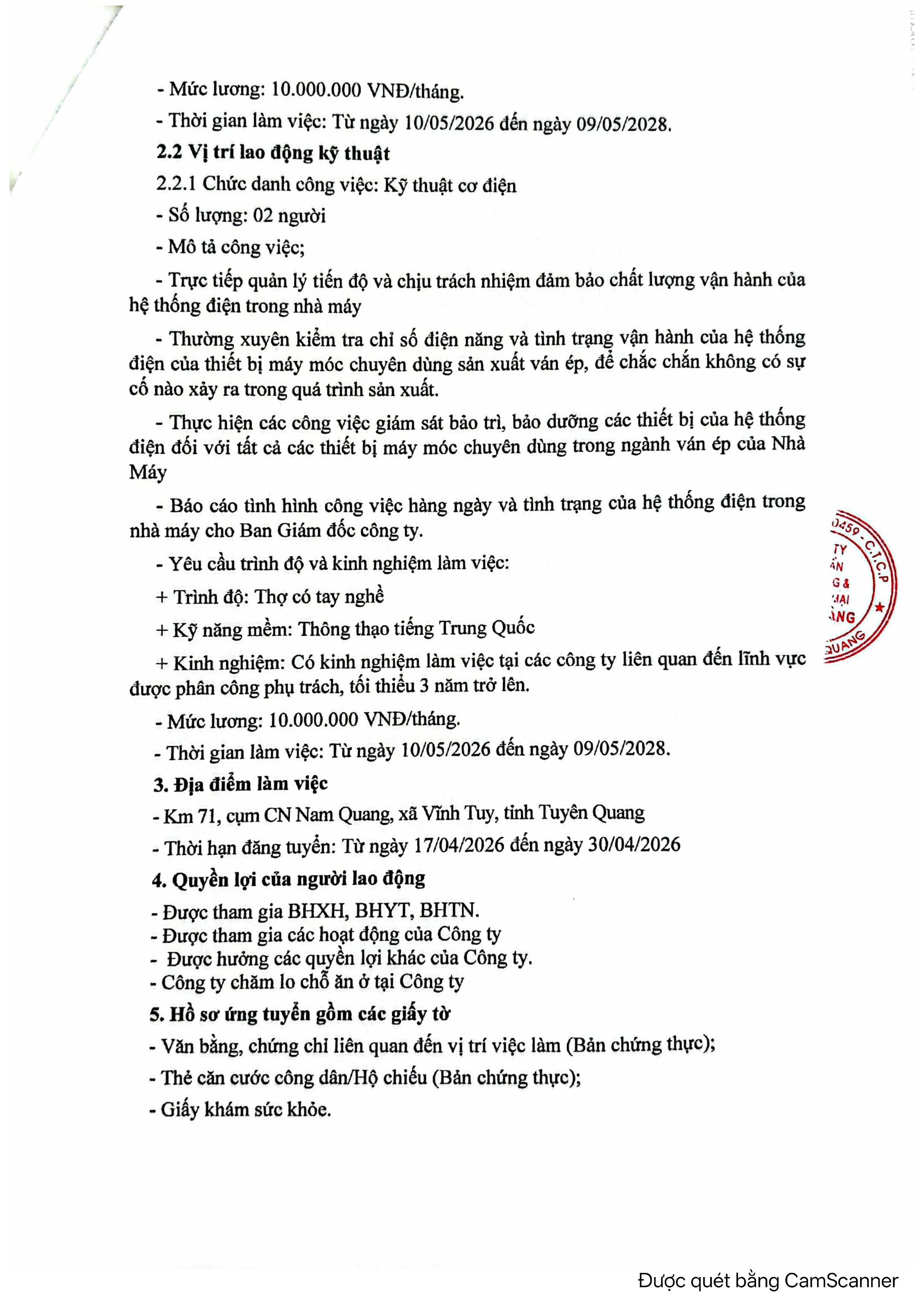 Ứng viên có nhu cầu vui lòng liên hệ: Trung tâm chính tại Tổ dân phố Hưng Thành 3, phường An Tường, tỉnh Tuyên Quang, số điện thoại 02073.818.239. Trụ sở 2 tại số nhà 224, tổ 13, phường Hà Giang 1, tỉnh Tuyên Quang, số điện thoại 02193.829.688. Văn phòng Chiêm Hóa tại thôn Vĩnh Khanh, xã Chiêm Hóa, tỉnh Tuyên Quang, số điện thoại 02073.851.699. Văn phòng Sơn Dương tại thôn Quyết Thắng, xã Sơn Dương, tỉnh Tuyên Quang, số điện thoại 02073.835.688. Văn phòng Bắc Quang tại thôn 9, xã Bắc Quang, tỉnh Tuyên Quang, số điện thoại 02193.822.386. Văn phòng Yên Minh tại tổ 1, xã Yên Minh, tỉnh Tuyên Quang, số điện thoại 02193.860.385